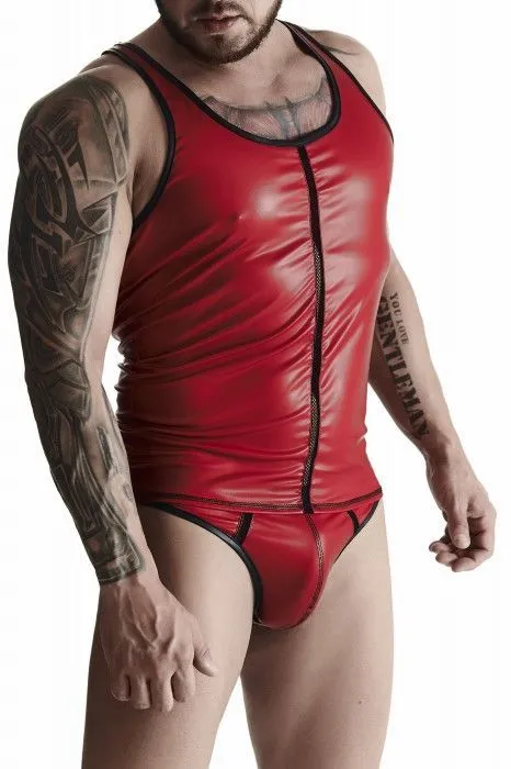 Красная мужская футболка без рукавов. Выполнена из мягкой высококачественной экокожи. Эластичная и приятная на ощупь, спереди сдержанная вертикальная декоративная сетчатая вставка. Все швы с укрепляющей строчкой.