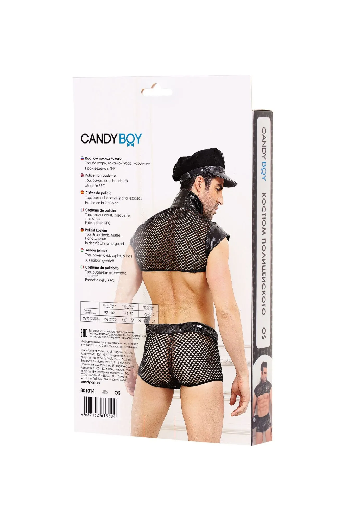 Стильный укороченный топ с отложным воротником легко расстегивается одним движением руки. Боксеры на широком эластичном поясе также дополнены провоцирующей молнией. Сочетание крупной сетки и материала wetlook выгодно подчеркивают достоинства фигуры. Пластиковые молнии без острых краев. Кепка с лаковым козырьком регулируется в обхвате. 2 значка с надписью City Police (англ. «Городская полиция») и пластиковые наручники входят в комплект.