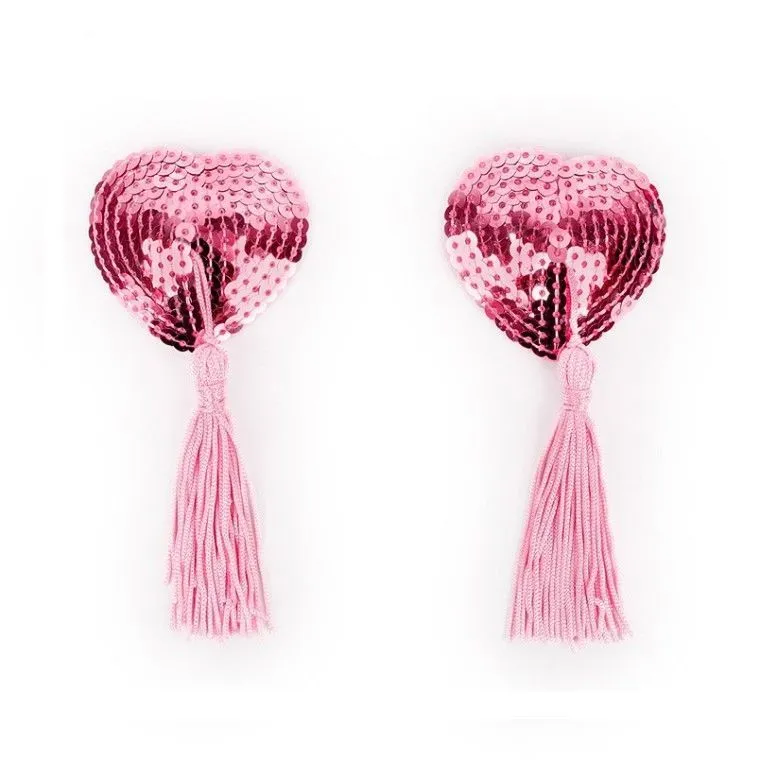 Розовые блестящие пестисы на грудь в форме сердечек с пайетками и кисточкой. Добавят изюминку в любовную игру, украсят соски, сделав грудь привлекательной и манящей. Внешняя сторона изделий отделана пайетками. На внутренней имеется специальный силиконовый слой, за счёт которого аксессуары держаться на сосках.