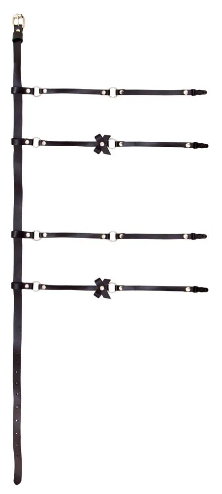 Пояс для чулок из черной натуральной кожи от компании Passion Belts - это сексуальный аксессуар, который дополнит комплект нижнего белья и придаст образу пикантности. Поясок украшен игривыми бантиками и имеет 4 ремешка для чулок с пряжками-клипсами.