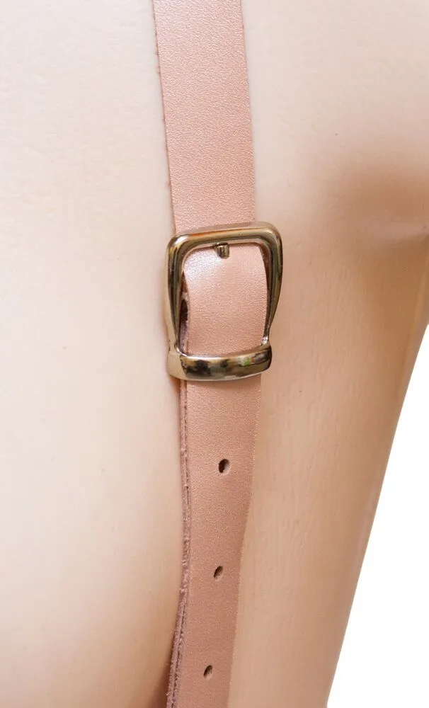 Портупея с двойным ремнем подойдет для повседневного ношения поверх одежды, а также для создания необходимого образа во время ролевых игр. Портупея выполнена из натуральной кожи светло-розового цвета, спереди ее украшает переплетение ремней с пряжками, а сзади ремни на талии накладываются один на другой. Надев данный аксессуар, Вы сможете подчеркнуть свой дерзкий стиль и раскрыть всю страстность своей натуры.