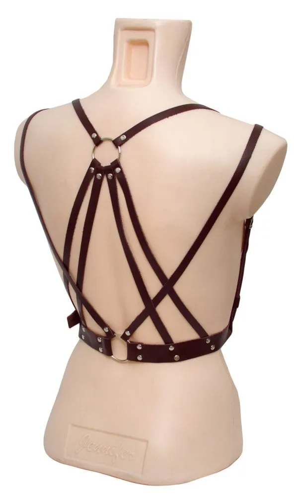 Портупея выполнена из кожи коричневого цвета и регулируется по размеру при помощи ремней. Сзади переплетение ремней, соединенных при помощи металлических колец, создает сложный и красивый узор, который будет притягивать к себе заинтересованные взгляды.