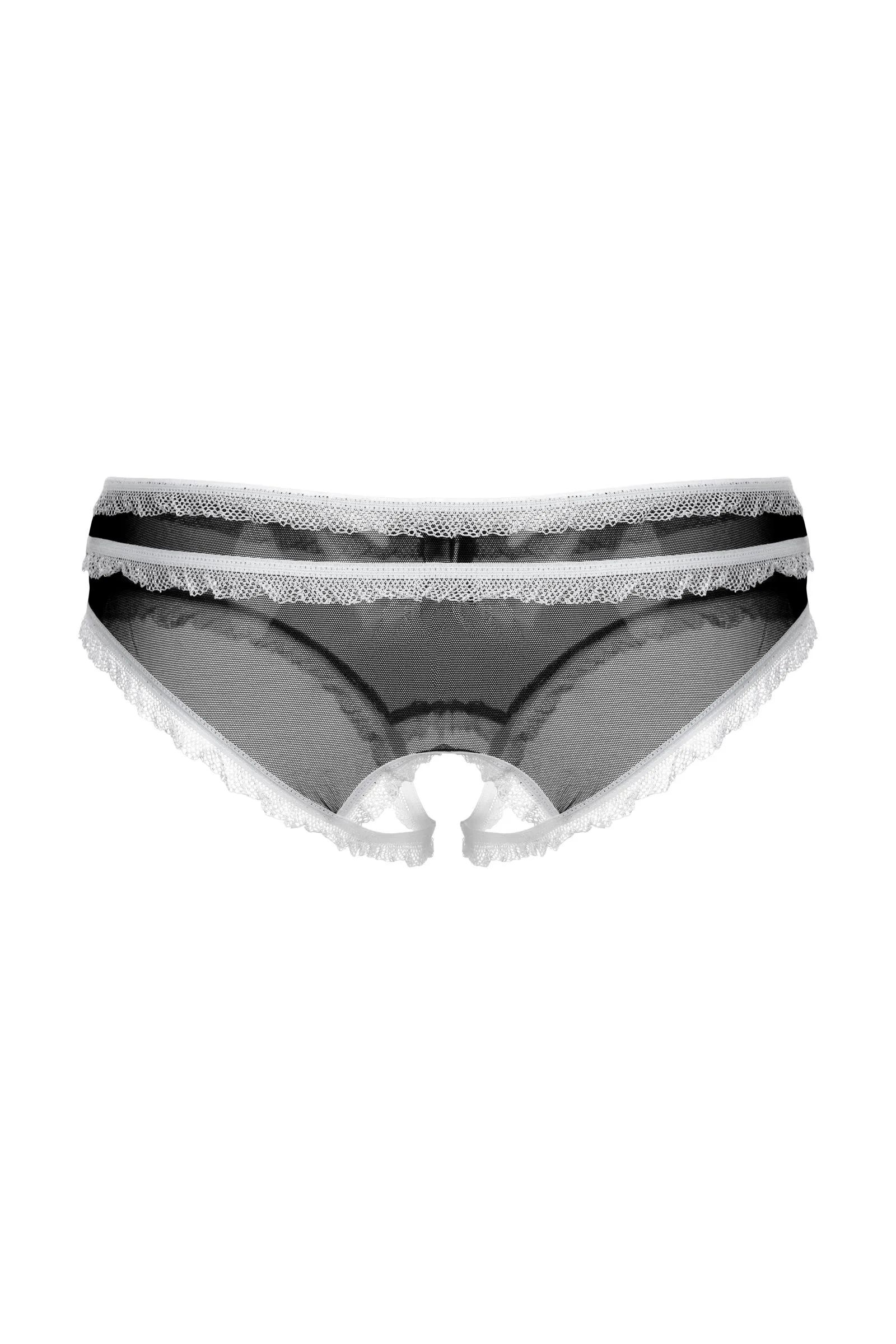 Трусики с открытым доступом. Нежная тонкая черная сеточка в сочетании с белой рюшей и бантиком создают завершенный соблазнительный образ.