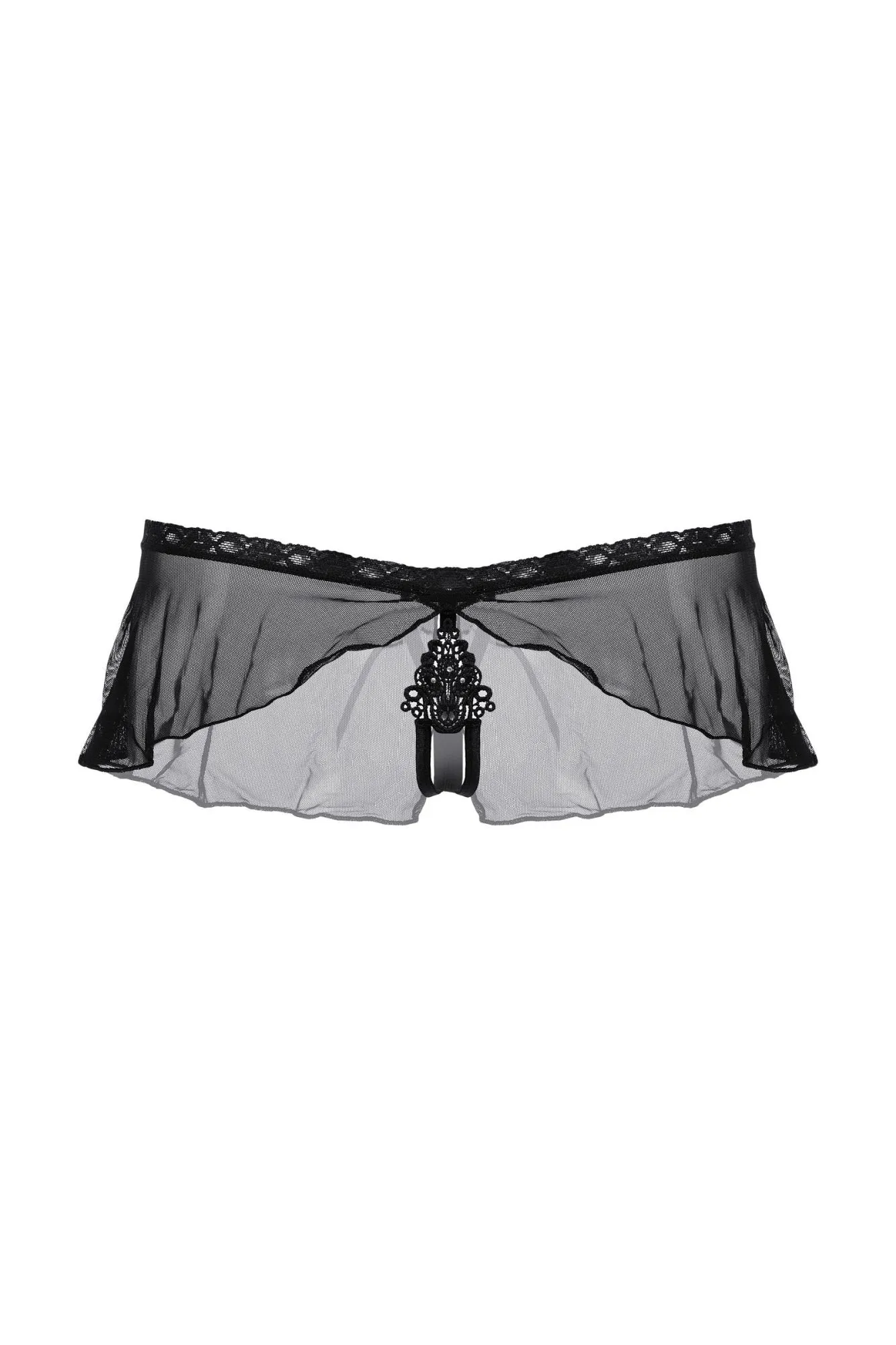 Оригинальные трусики с открытым доступом. Нежное кружево, необычный углубленный верхний край, легкий струящийся тюль и кокетливый бантик сзади создают обольстительный образ.