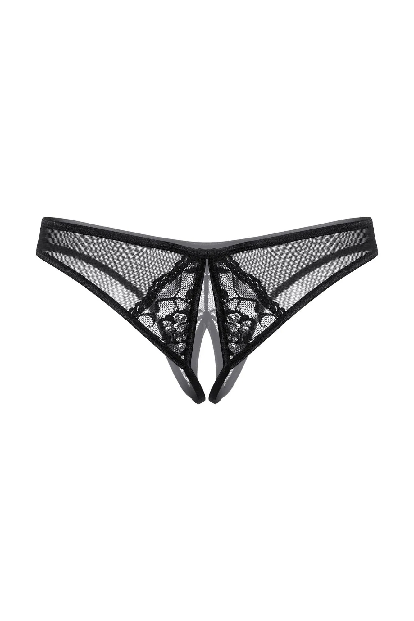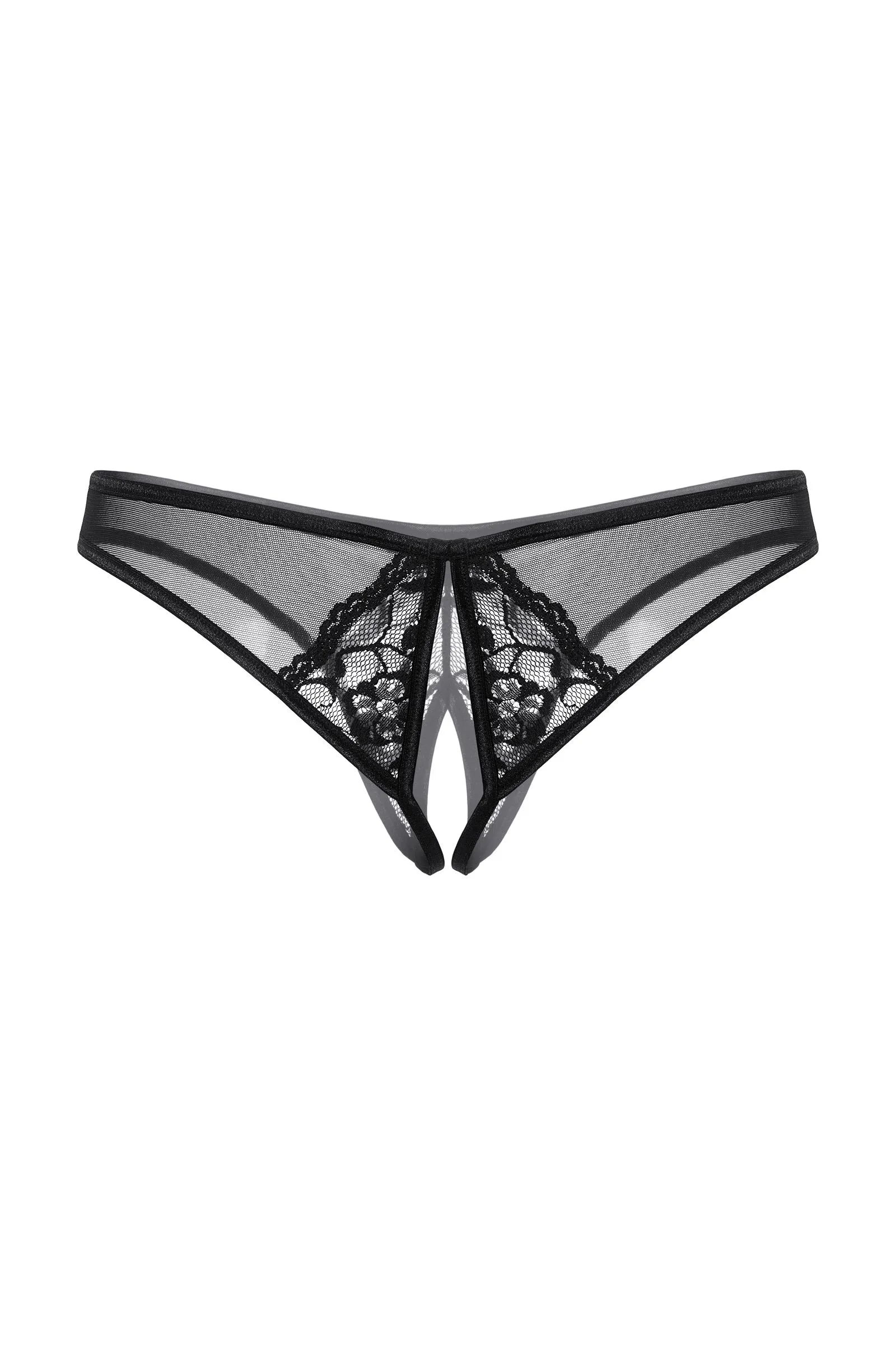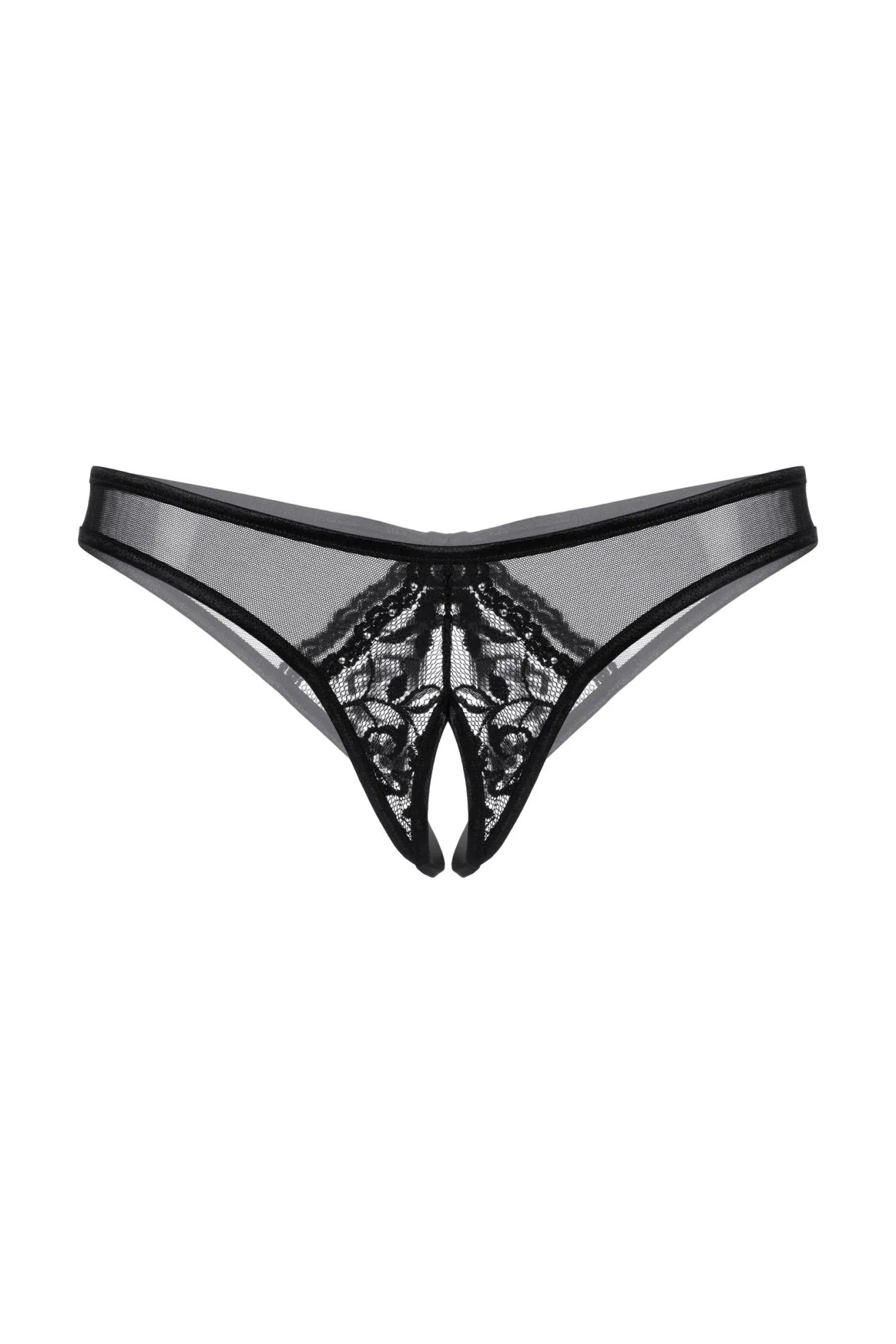 Трусы с доступом, выполненные из тонкой сетки в сочетании с кружевом, декорированы стразами.