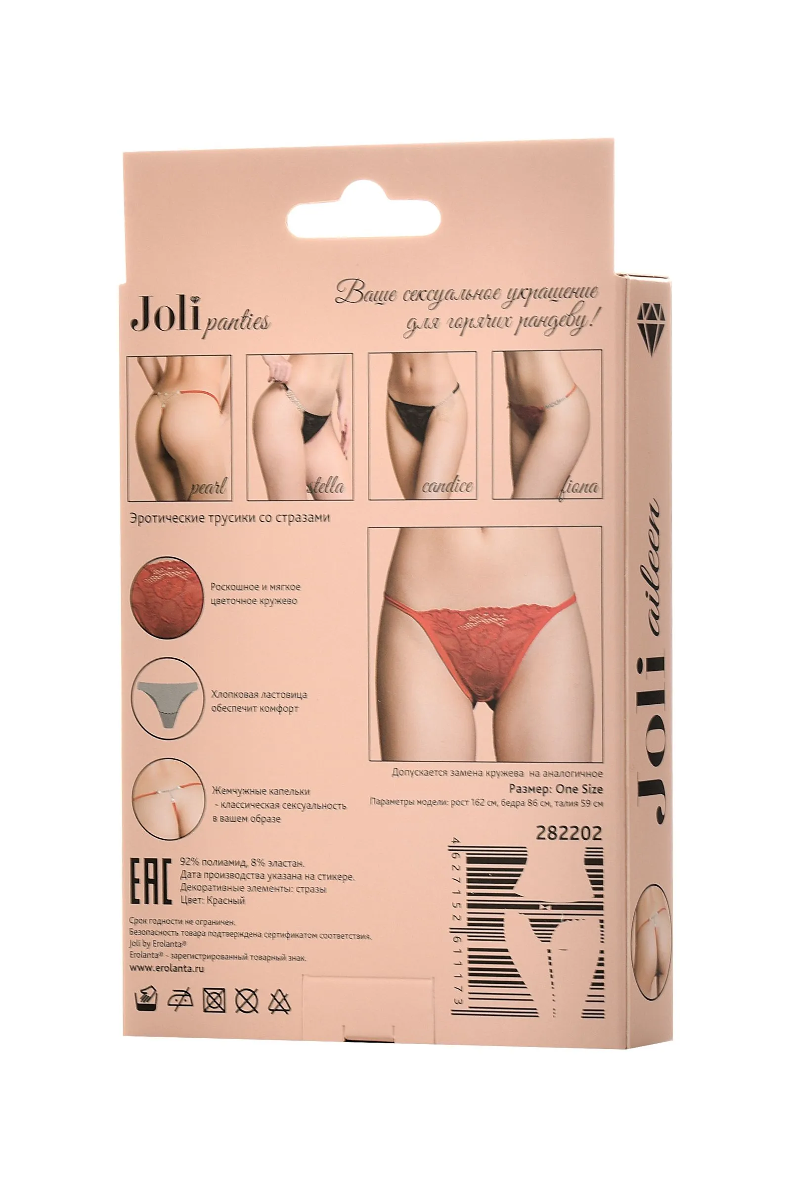 Joli panties – ваше сексуальное украшение для горячих рандеву! Новая линейка романтичного белья Joli (в пер. с французского красивая) радует глаз элегантными деталями и нежными материалами европейского качества. Элегантные кружевные трусики подчеркнут вашу индивидуальность. Тонкие, мягкие лямочки и хлопковая ластовица обеспечат комфортные ощущения. Три жемчужные капельки у основания ягодиц - благородный и сексуальный акцент. Joli panties – выбери украшение для обольщения!
