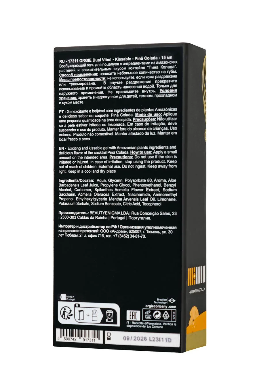Dual Vibe! Pinã Colada от Orgie — это не просто вибрирующий интимный гель, это уникальное сочетание страсти и роскоши, созданное для тех, кто ценит неповторимые моменты в интимной жизни. Жидкий вибратор для поцелуев изысканно сочетает в себе мягкость и силу вибрации, добавляя дополнительный элемент возбуждения к вашим интимным моментам. Активные компоненты стимулируют кровообращение в эрогенных зонах, дополняя ощущения мурашками.