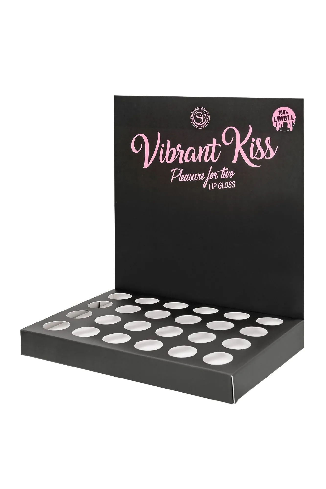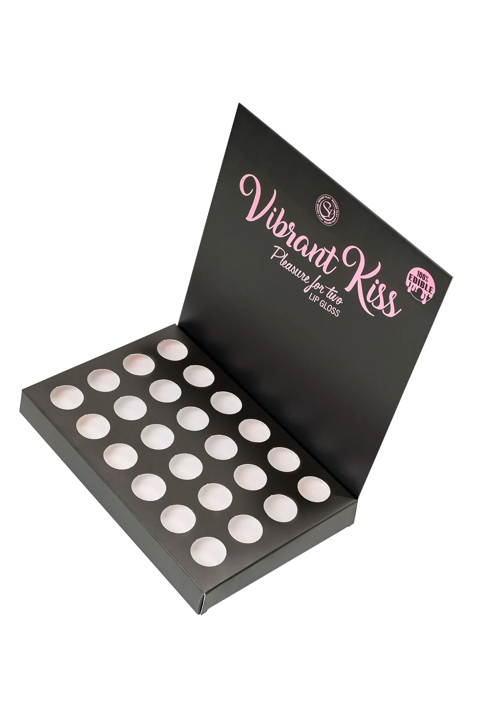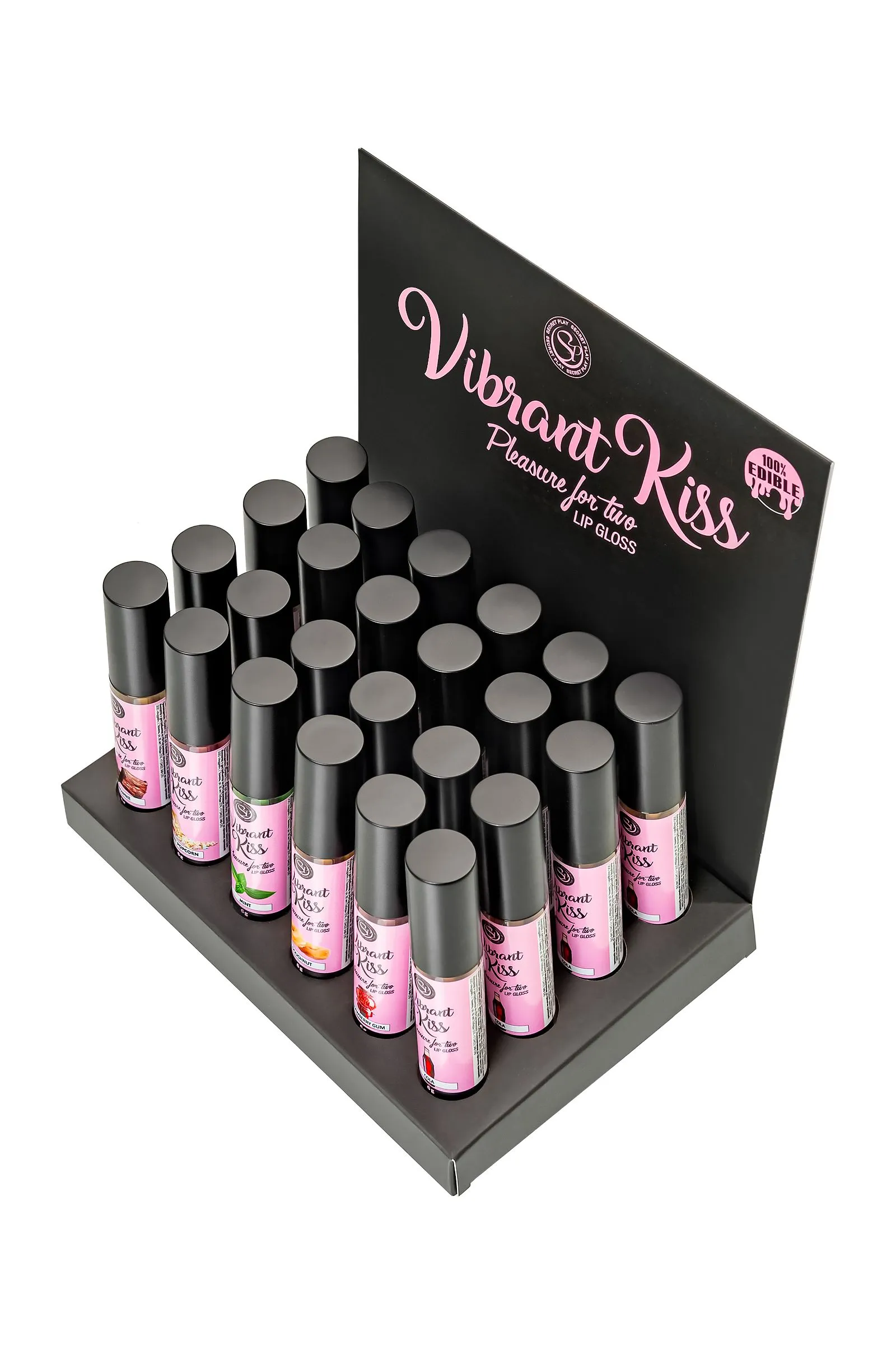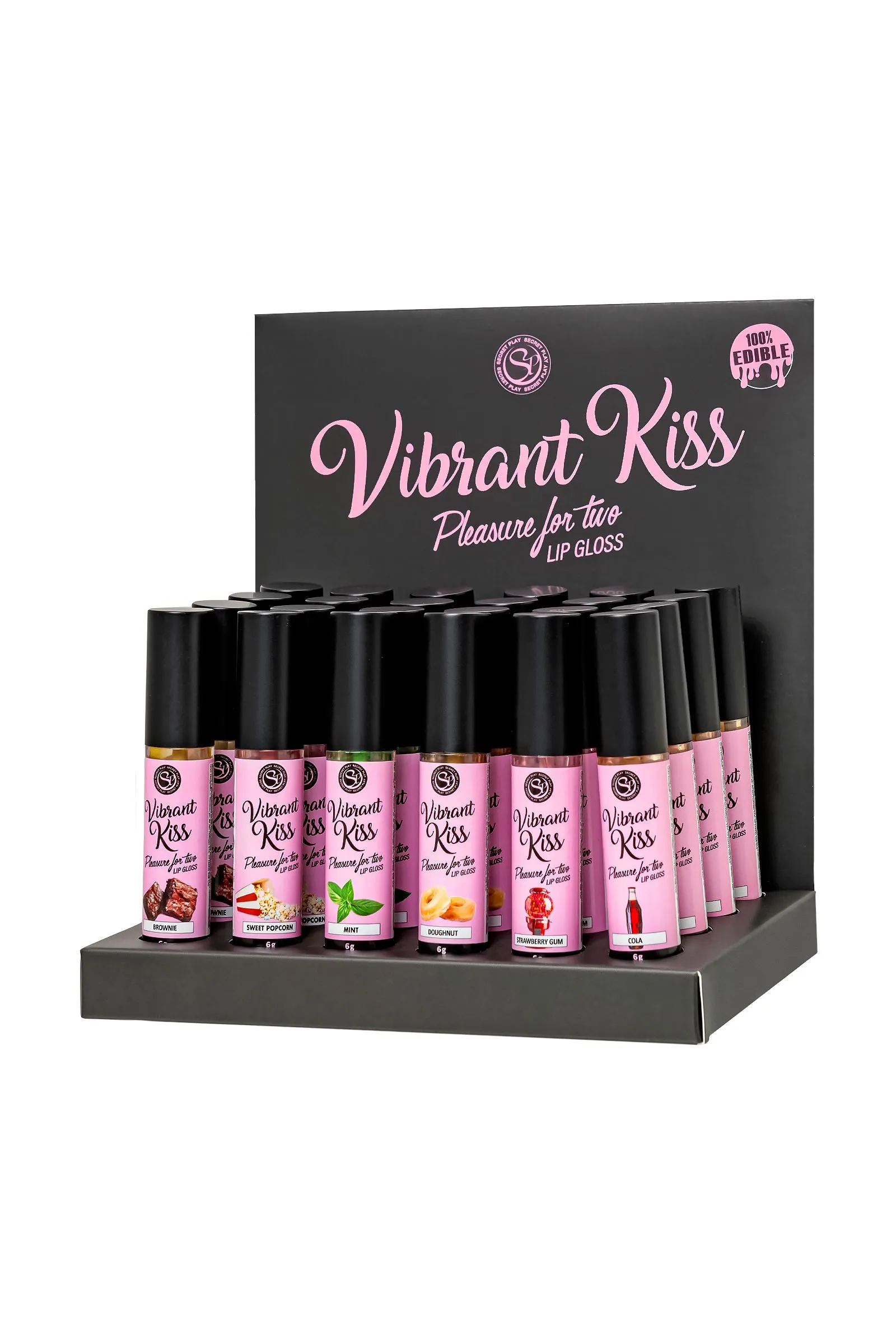 Восхитительные ощущения от сочетания сладкого поцелуя и волшебных мурашек дарят блески для губ Lip Gloss Vibrant Kiss. Ощущение взрыва, перед которым невозможно устоять. Блеск может доставить удовольствие обоим партнерам стимулирующими вибрационными волнами, которые ощутимы уже через несколько секунд после нанесения на губы. Его вибрационные волны вызывают приятное покалывание, которое способствует стимуляции нервных окончаний и повышает чувствительность эрогенных зон, увеличивая удовольствие. Партнер ощутит мурашки при поцелуе и в интимной зоне при оральном сексе. Кроме того, этот блеск придает 3D эффект губам, делая их более сочными и объемными. Стильный дисплей-подставка в цветах бренда гарантированно вызывает интерес покупателей. Установите дисплей в прикассовой зоне, чтобы эффектно оформить витрину. Выбирайте один из 6 восхитительных вкусов, или миксуйте разные сочетания, которые на 100% съедобны. Набор из 6 разнообразных вкусов и ароматов в специальном дисплее-подставке включает в себя: 4 блеска для губ Vibrant Kiss Strawberry Gum с умопомрачительным вкусом и ароматом клубничной жвачки, арт. 3653 4 блеска для губ Vibrant Kiss Mint – вкус и аромат сладкой освежающей мяты, арт. 3645. 4 блеска для губ Vibrant Kiss Brownie – вкус и аромат шоколадного печенья, арт. 3655 4 блеска для губ Vibrant Kiss Coke – вкус и аромат Колы, арт. 3657. 4 блеска для губ Vibrant Kiss Sweet Popcorn – вкус и аромат попкорна, арт. 3658. 4 блеска для губ Vibrant Kiss Doughnut – вкус и аромат пончика, арт. 3656. Способ применения: Нанесите на губы, через несколько секунд вы почувствуете стимулирующую вибрацию. Объем: 6 гр Глицериновая основа Совместимость с презервативами и игрушками 100% съедобно Перед использованием взболтать Сделано в Испании Меры предосторожности: Встряхните перед использованием. Не используйте при гиперчувствительности или аллергии на ингредиенты. Не наносите на глаза или на раны. Держись подальше от детей. Держите в прохладном, сухом месте, вдали от солнечных лучей. В случае раздражения прекратить использование.