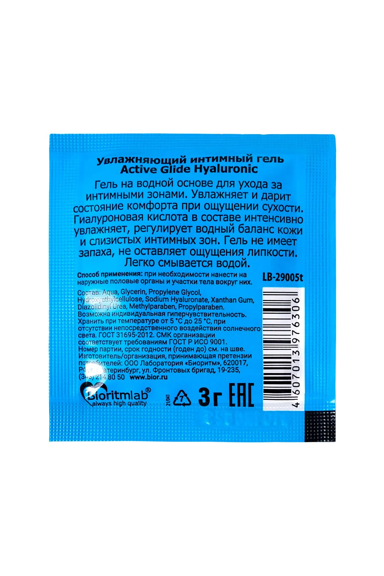 Нежный гель-любрикант на водной основе Active Glide с гиалуроновой кислотой интенсивно и длительно увлажняет и смягчает интимные зоны, устраняет сухость влагалища, восполняет недостаток женской смазки, дарит приятное продолжительное скольжение во время близости, снимает раздражения, препятствует появлению микротравм. Входящая в состав любриканта гиалуроновая кислота нормализует водный баланс клеток, способствует регенерации кожи и слизистых, обеспечивает эластичность тканей половых органов. снижает чувствительность кожи, усиливает её защитные функции. Гель-любрикант Active Glide с гиалуроновой кислотой обеспечивает бережный уход за интимными зонами женщин и мужчин. Не имеет цвета и запаха, легко смывается водой.