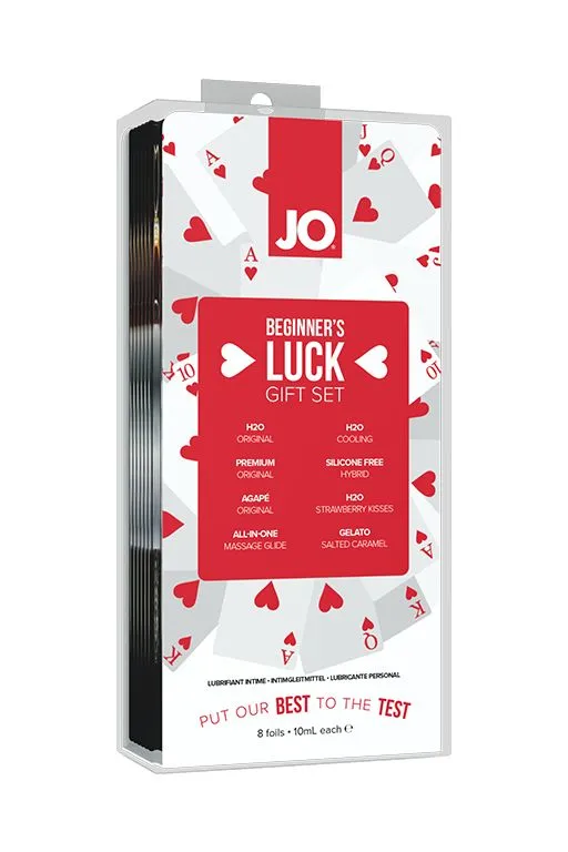 Набор состоит из восьми саше популярных интимных лубрикантов: нейтральный лубрикант на водной основе JO H2O, охлаждающий лубрикант на водной основе JO H2O Cooling, нейтральный лубрикант на силиконовой основе JO Premium, водно-кокосовый гибрид JO Hybrid, лубрикант для особо чувствительных женщин JO Agape, вкусовой клубничный лубрикант JO Flavored Strawberry Kiss, возбуждающий массажный гель-лубрикант на силиконовой основе JO All-in-One, вкусовой лубрикант «соленая карамель» JO Gelato.
