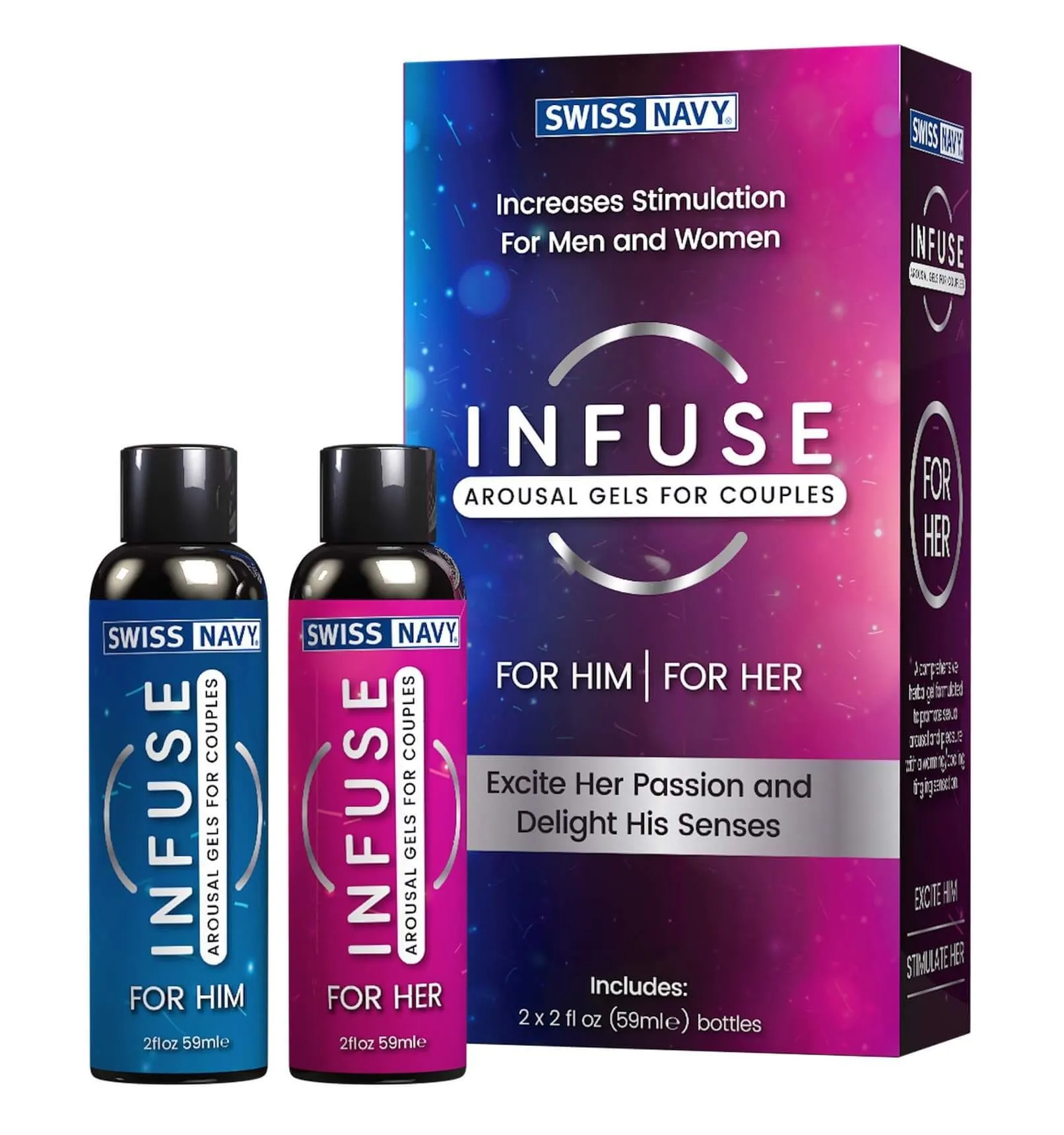 Infuse включает в себя 2 бутылочки с лубрикантами по 59 мл каждая для него и для нее. После использования лубриканта эрекция мужчины становится более устойчивой и продолжительной, а женщина становится более чувствительной и возбужденной. Infuse 2 в 1 - это идеальное решение для пары, желающей улучшить свою интимную жизнь. Лубрикант на водной основе, поэтому он отлично совместим с различными игрушками.