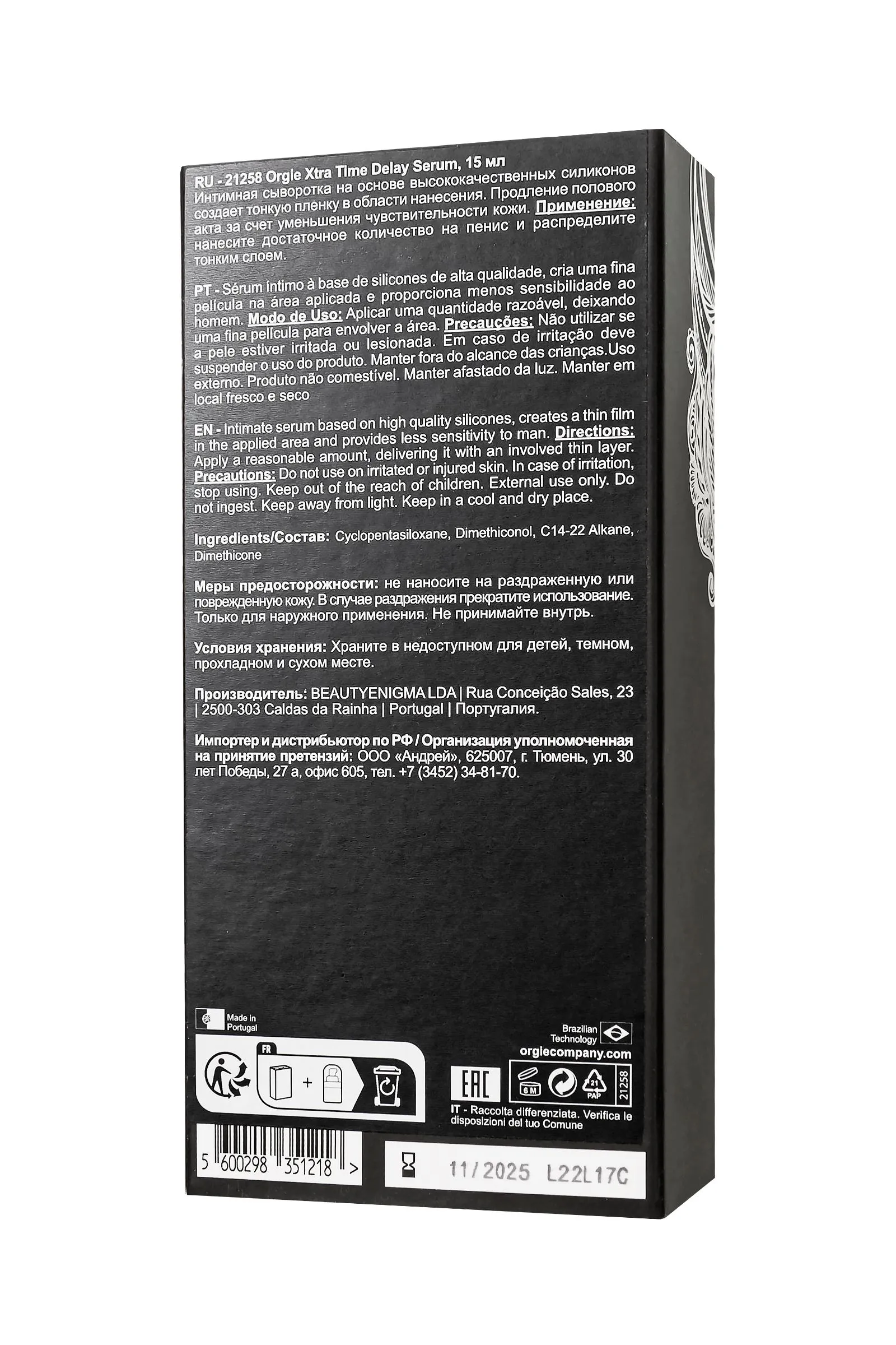 Откройте новую главу удовольствия с сывороткой Xtra Time Delay Serum от знаменитого бренда ORGIE! В ее основе – высококачественный силикон, который нежно обволакивает пенис тонкой пленкой, способствуя снижению его чувствительности. И это не анестетики! Забудьте о бензокаине и лидокаине. Функция сыворотки Xtra Time Delay - уменьшение чувствительности полового члена, которое приносит максимум удовольствия. Забудьте о трении и сконцентрируйтесь на наслаждении. Пусть удовольствие продлится дольше, чем вы ожидали. Удобный флакон с дозатором объемом 15 мл содержит около 75 доз удовольствия. Применение – элементарное: нанесите одну-две дозы сыворотки перед интимным моментом на эрегированный пенис. Повторите еще раз, если пожелаете. Не забывайте, что это удивительное дополнение не заменяет презервативы. Любите и наслаждайтесь самыми сокровенными моментами столько, сколько пожелаете. А Orgie будет сопровождать вас в каждом мгновении чтобы усилить ваше удовольствие.
