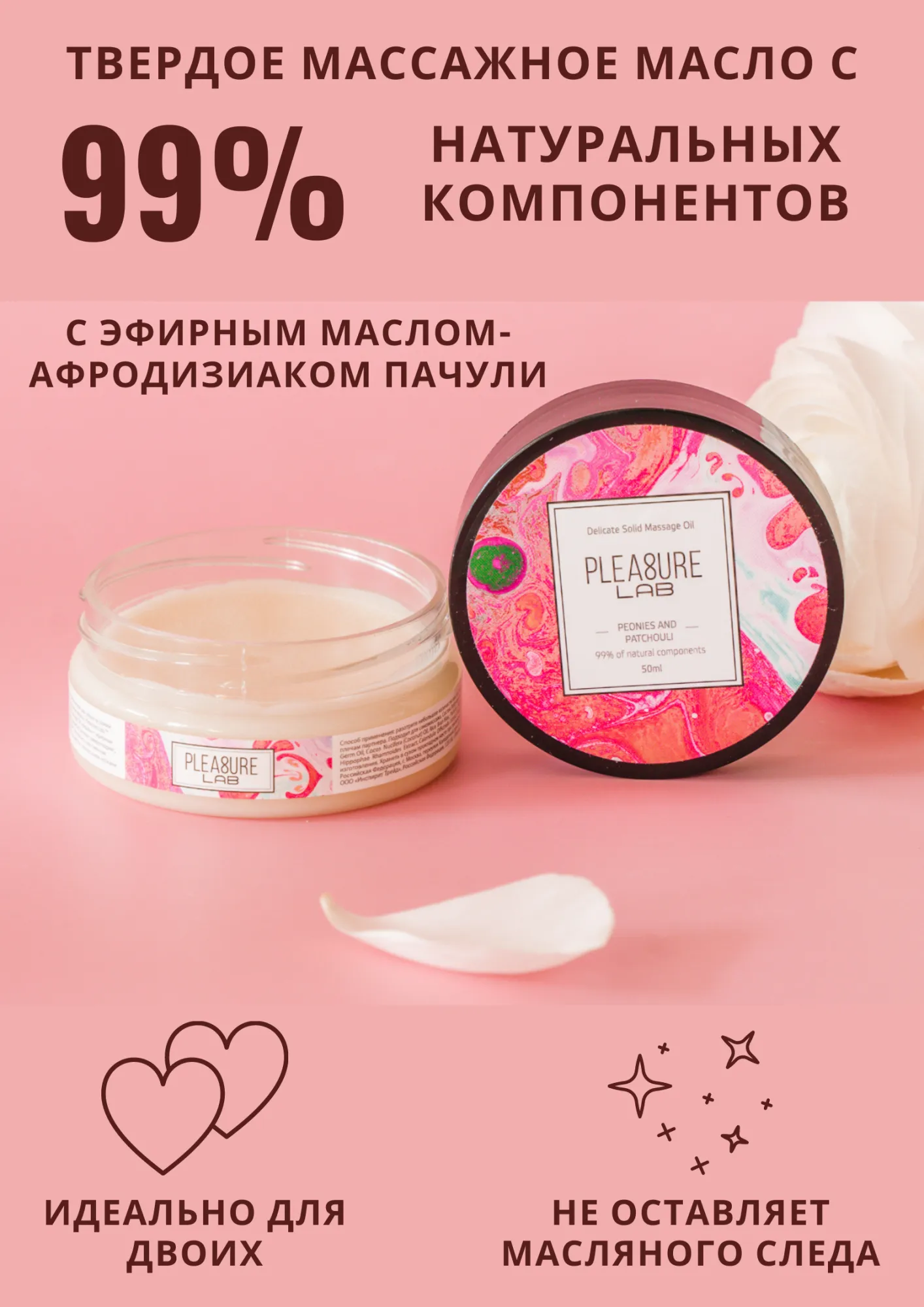 Pleasure Lab Delicate с ароматом пионов и эфирным маслом-афродизиаком пачули умиротворяет, а также обладает легким, но чувственным шлейфом летних цветов с мускусными нотками. Способ применения: разотрите небольшое количество масла в ладонях и медленно начните продвигаться массирующими движениями от ступней к спине и плечам партнера. Подходит для самомассажа.  Состав: масло ши (карите), миндальное масло, масло зародышей пшеницы, масло кокосовое, воск рисовых отрубей, парфюмерная композиция, эфирное масло пачули, СК-СО2 экстракты (розмарин, лимон, облепиха, календула), натуральный антиоксидант (токоферол (смесь), бета-ситостерол, сквален), витамин Е. Срок годности- 2 года.