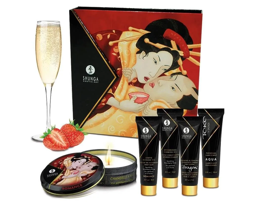 В набор Shunga Geisha's Secrets Sparkling Strawberry Wine входят: