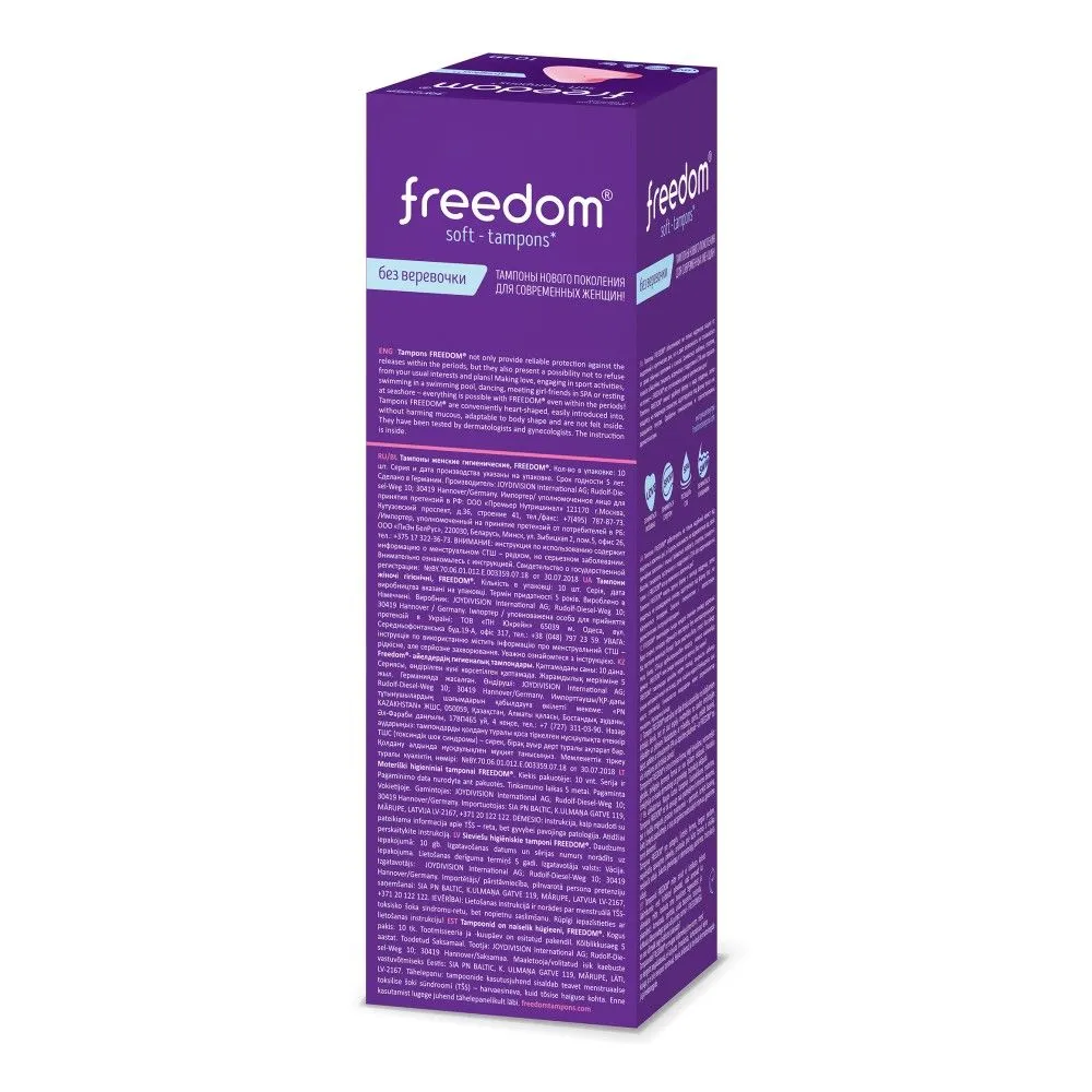 100% безопасный медицинский материал, разработанный для тампонов Фридом экспертным советом в Германии, не пересушивает слизистую и не травмирует ткани при введении и извлечении. Материал тампонов FREEDOM не увеличивается в размерах при впитывании. Вот прочему FREEDOM - это комфортные тампоны для секса и спорта, купания и активного образа жизни. Купание с тампоном, тренировки, фитнес и даже секс с тампоном – теперь ничто не помешает!
