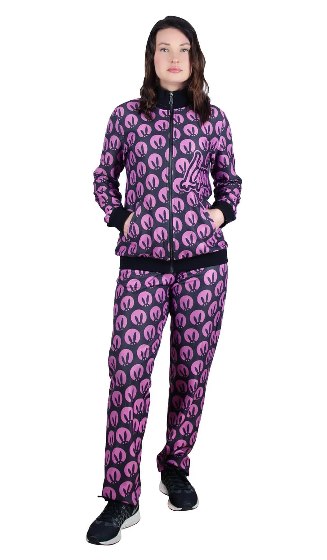 Стильный чёрный костюм с оригинальным розовым принтом от "Pink Rabbit" - это стильное решение на каждый день. Состоит из легкой толстовки на молнии и штанов. Наш фирменный принт делает костюм единым целым и подчеркивает вашу индивидуальность. Для домашнего вечера идеально подойдёт мягкий и гладкий материал костюма. А любители спорта оценят эластичные, не стесняющие движений резинки. Легко стирается и не мнётся, сохраняет форму и не растягивается. Стойкий цвет надолго оставит костюм таким же ярким, как и в первый день покупки.