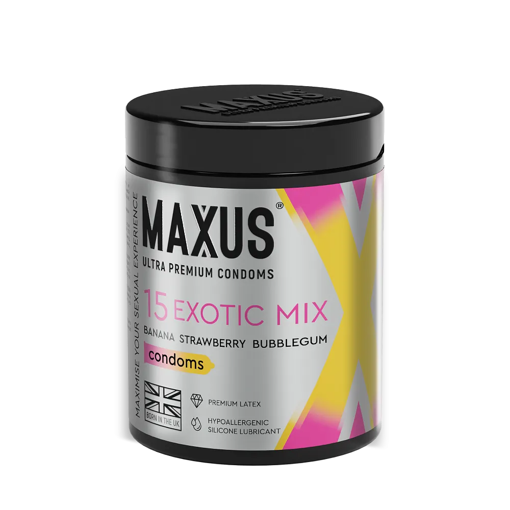 «MAXUS Exotic Mix» — для тех, кто любит разнообразие и никогда не отказывается от «сладенького». Три разных цвета и аромата (банан, клубника и баблгам). Презервативы гладкие цветные и ароматизированные. Позволят побаловать себя экзотическими ароматами. «MAXUS» - идеальный партнёр для оральных контактов.