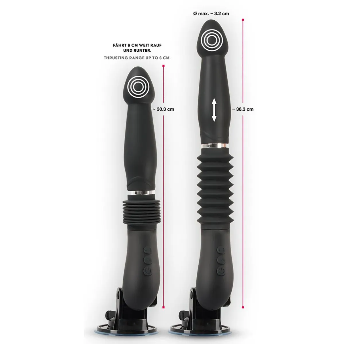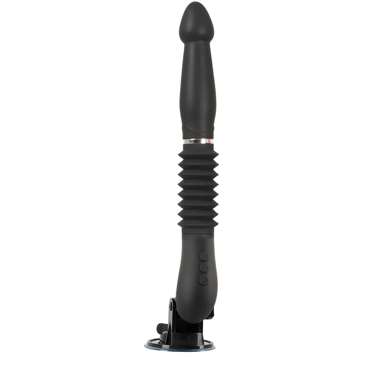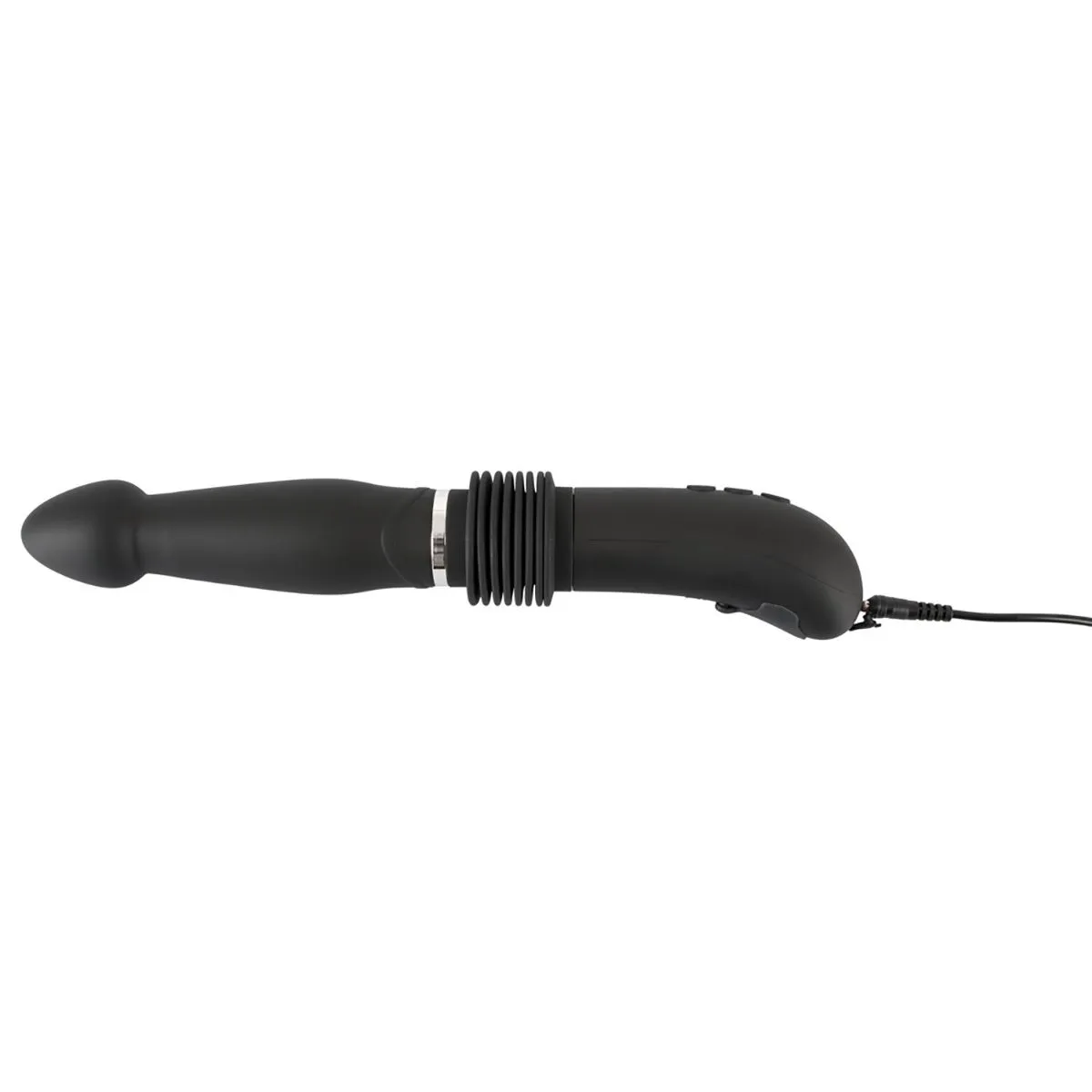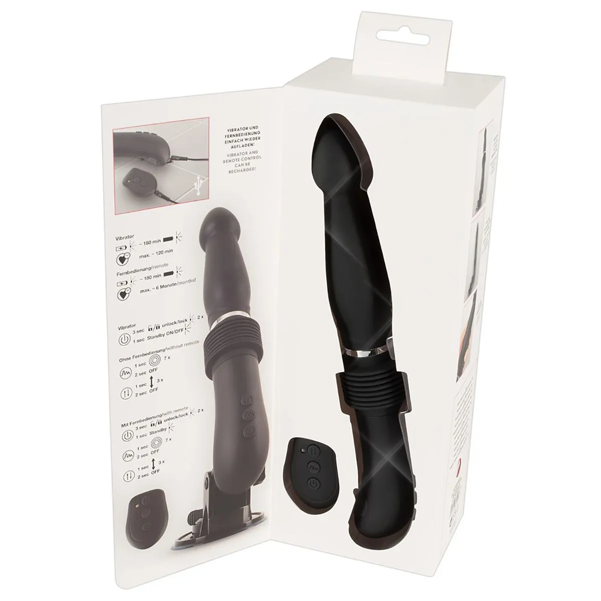 Этот вибратор выделяется своими глубокими толчками (до 6 см) на 3 регулируемых скоростях. Это не только скорость и глубина толчков, а так же 7 режимов вибрации (которые можно контролировать отдельно). Мягкая поверхность и форма фоллоимитатора помогают этой машине скользить достаточно глубоко и стимулировать все зоны внутри. Регулируемая и съемная присоска вместе с пультом дистанционного управления делает возможным использование без рук. Дистанционное управление также означает, что партнер может взять управление на себя. Прилагаемый USB-кабель можно использовать для зарядки пульта дистанционного управления и вибратора.