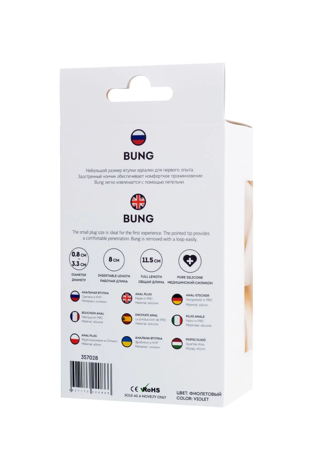 Bung Небольшой размер втулки идеален для первого опыта. Заостренный кончик обеспечивает комфортное проникновение. Bung легко извлекается с помощью петельки.