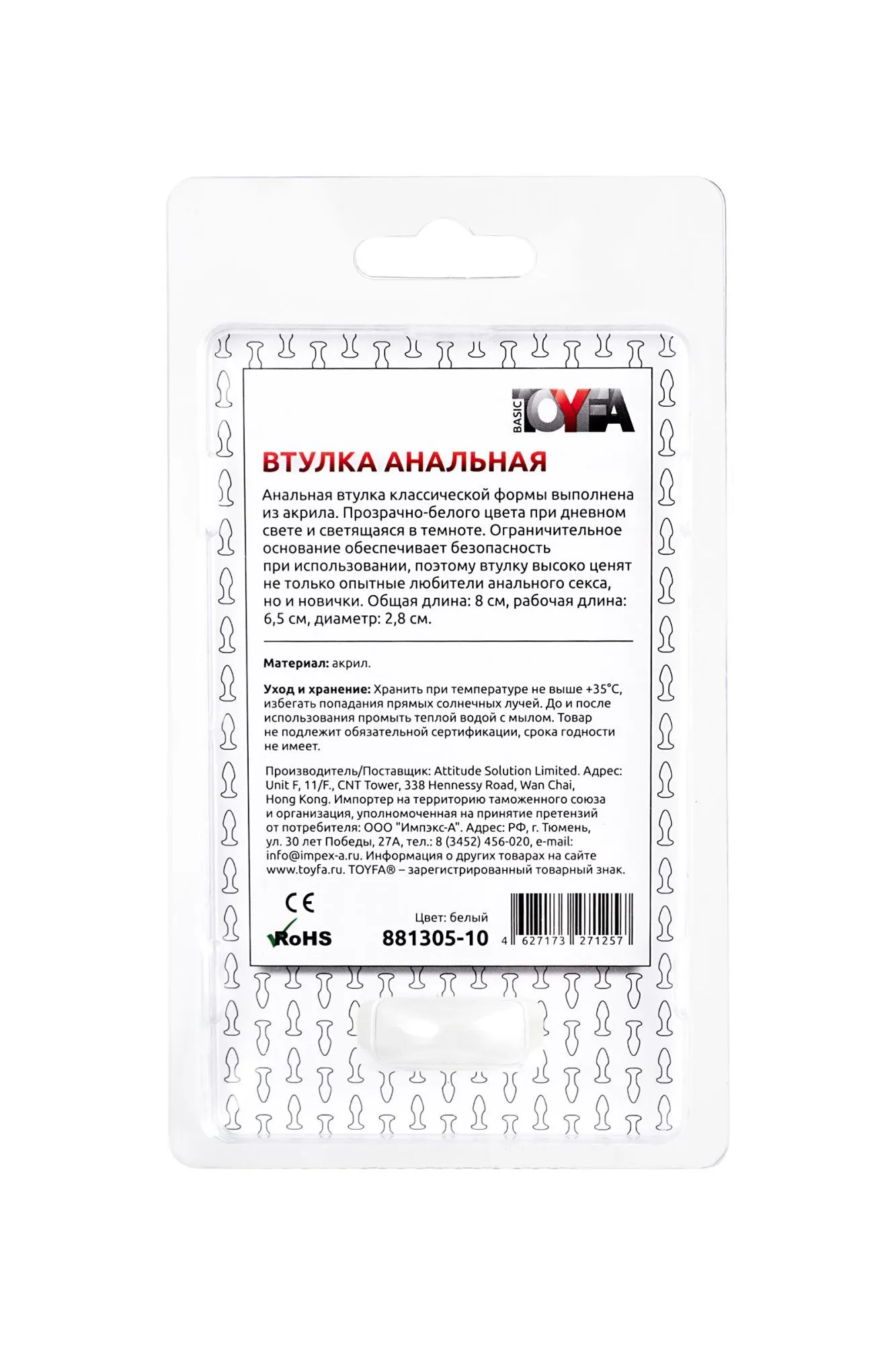 —Анальная втулка TOYFA, акрил, белый, 8 см, Ø 2,8 см
