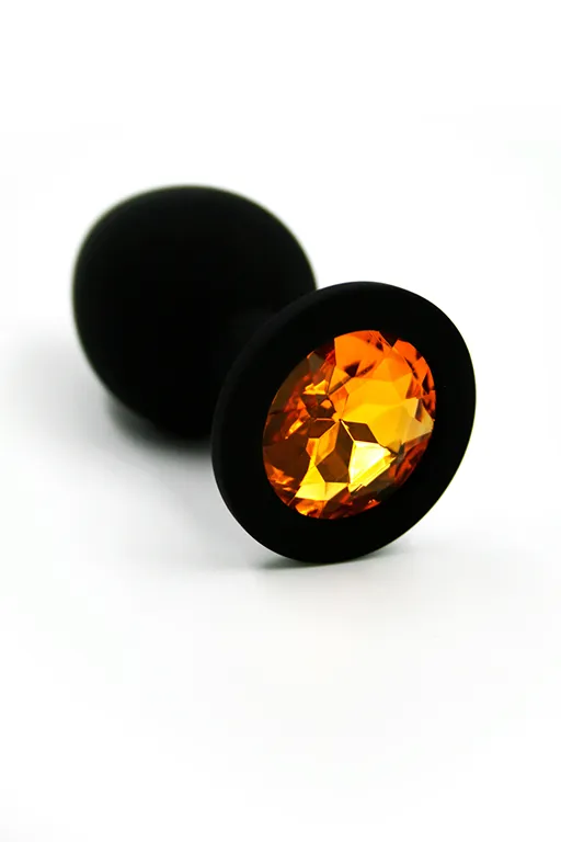 Анальная пробка из силикона черного цвета, размер M. Длина - 7 см, диаметр - 3,5 см, вес - 46,5 грамма. Страз в основании круглой формы, выполнен из стекла желтого цвета. Упакована в вельветовый мешочек для хранения.