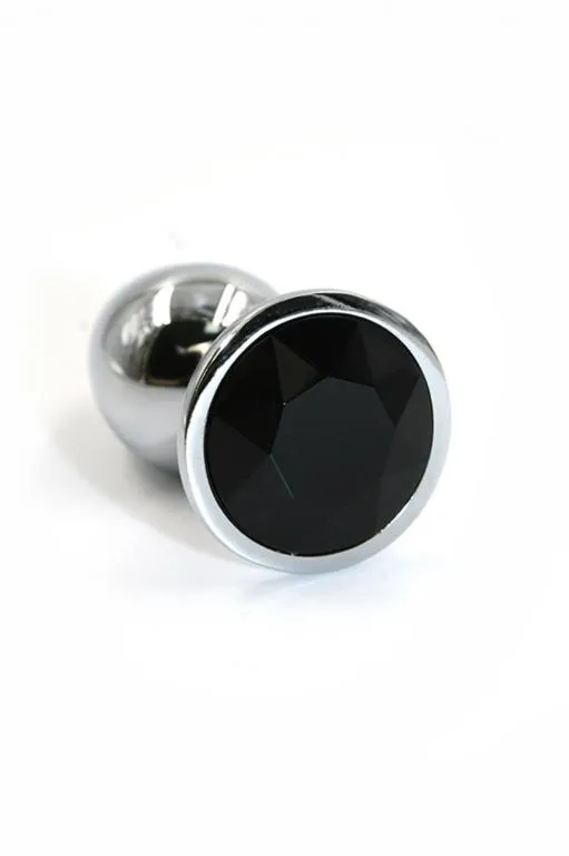Анальная пробка из аллюминия размер L. Длина - 8,4 см, диаметр - 4 см, вес - 165,5 грамма. Страз в основании круглой формы, выполнен из стекла черного цвета. Упакована в вельветовый мешочек для хранения.