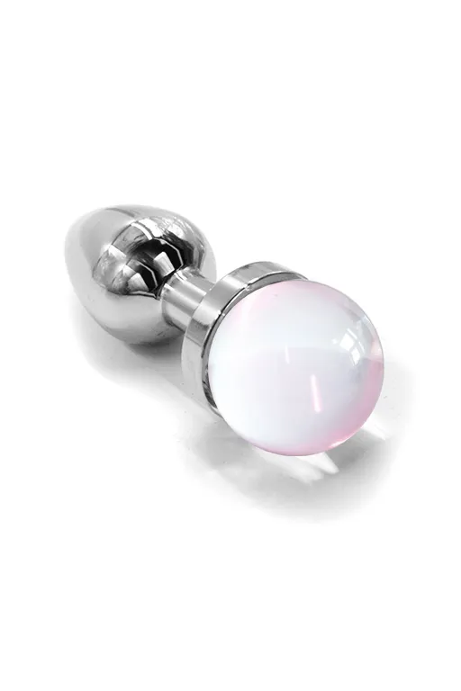 Анальная пробка из аллюминия размер S. Длина - 6 см, диаметр - 2,8 см, вес в 85 грамма. Изделие дополнено выпуклым украшением из стекла сферической формы прозрачного цвета. Упакована в вельветовый мешочек для хранения.