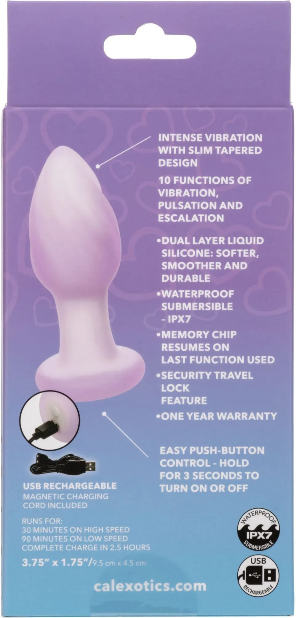 Изготовленный из двухслойного жидкого силикона, этот девайс не только ощущается более мягким и гладким на вашей коже, но также отличается высокой прочностью и полностью водонепроницаемостью. Кроме того, его современный чип памяти запоминает вашу последнюю использованную функцию, позволяя без усилий продолжить ваше приятное путешествие. Функция блокировки безопасности для путешествий гарантирует, что ваши приключения будут столь же незаметными, сколь и захватывающими. Пробка заряжается через USB. Полная зарядка занимает всего 2,5 часа, предлагая вам 30 минут высокоскоростной интенсивности или 90 минут продолжительного удовольствия на более низкой скорости.