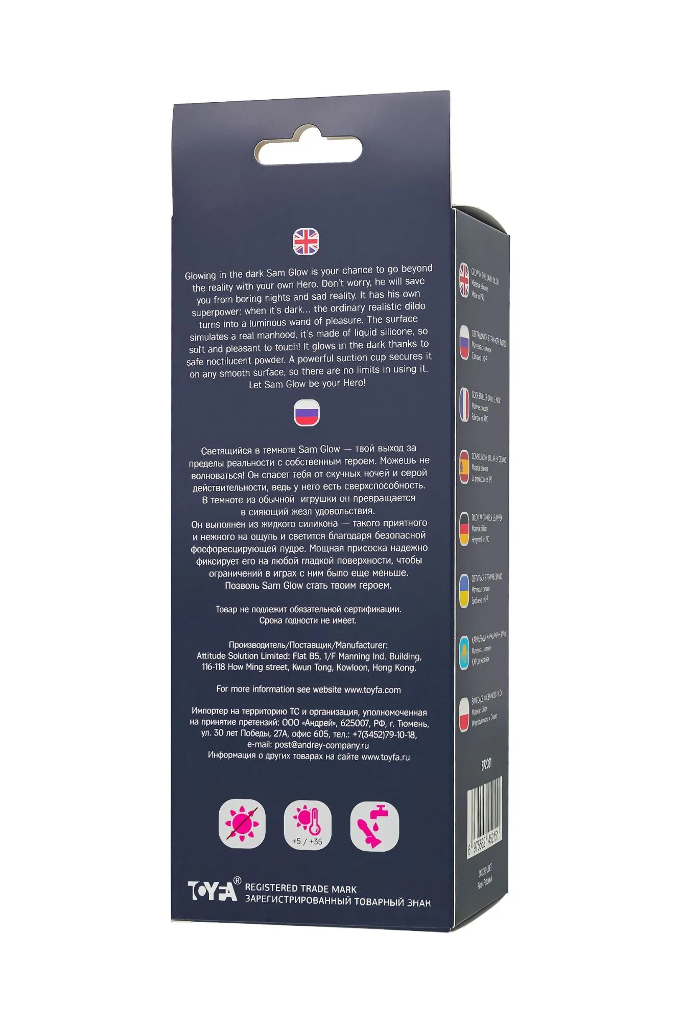 Светящийся в темноте Sam Glow — твой выход за пределы реальности с собственным героем. Можешь не волноваться! Он спасет тебя от скучных ночей и серой действительности, ведь у него есть сверхспособность. В темноте из обычной игрушки он превращается в сияющий жезл удовольствия. Он выполнен из жидкого силикона — такого приятного и нежного на ощупь и светится благодаря безопасной фосфоресцирующей пудре. Мощная присоска надежно фиксирует его на любой гладкой поверхности, чтобы ограничений в играх с ним было еще меньше. Позволь Sam Glow стать твоим героем. Материал - силикон Полностью светится в темноте Общая длина 17 см Водонепроницаемый