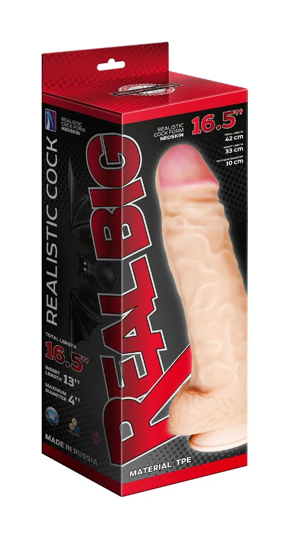 Реалистик большого размера из материала «NEOSKIN». Использована технология нанесения сверхмягкого материала на эластичный, полужесткий каркас. Подобрано оптимальное соотношение упругости, мягкости , тактильных ощущений – словом всего того, что напоминает биологический прототип, но очень больших размеров. Длина общая - 42см, длина рабочая - 33 см, диаметр - 10см, диаметр головки - 8,9см