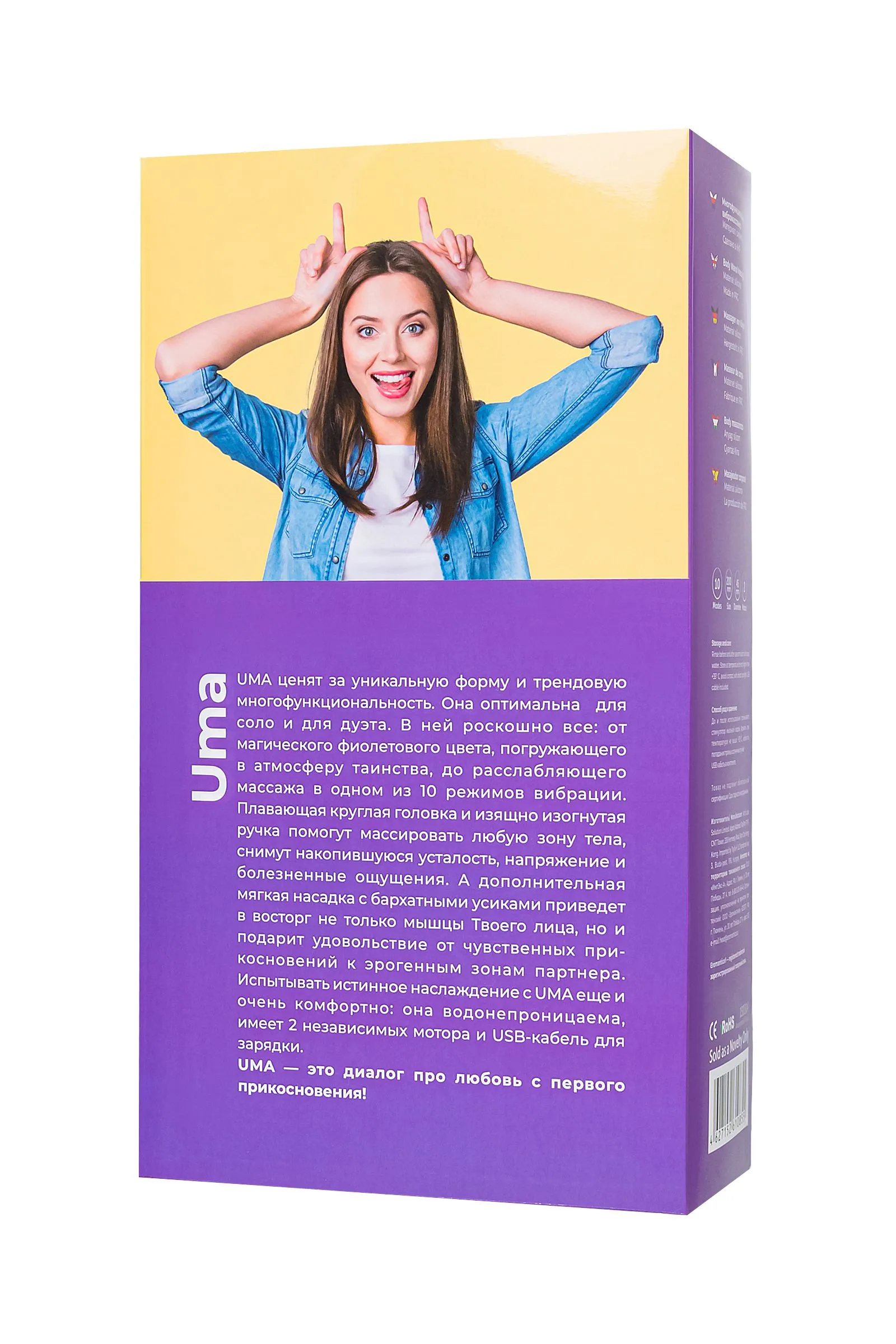 UMA ценят за уникальную форму и трендовую многофункциональность. Она оптимальна для соло и для дуэта. В ней роскошно всё: от магического фиолетового цвета, погружающего в атмосферу таинства, до расслабляющего массажа в одном из 10 режимов вибрации. Плавающая круглая головка и изящно изогнутая ручка помогут массировать любую зону тела, снимут накопившуюся усталость, напряжение и болезненные ощущения. А дополнительная мягкая насадка с бархатными усиками приведёт в восторг не только мышцы Твоего лица, но и подарит удовольствие от чувственных прикосновений к эрогенным зонам партнёра. Испытывать истинное наслаждение с UMA ещё и очень комфортно: она водонепроницаема, имеет 2 независимых мотора и USB-кабель для зарядки. UMA – это диалог про любовь с первого прикосновения!