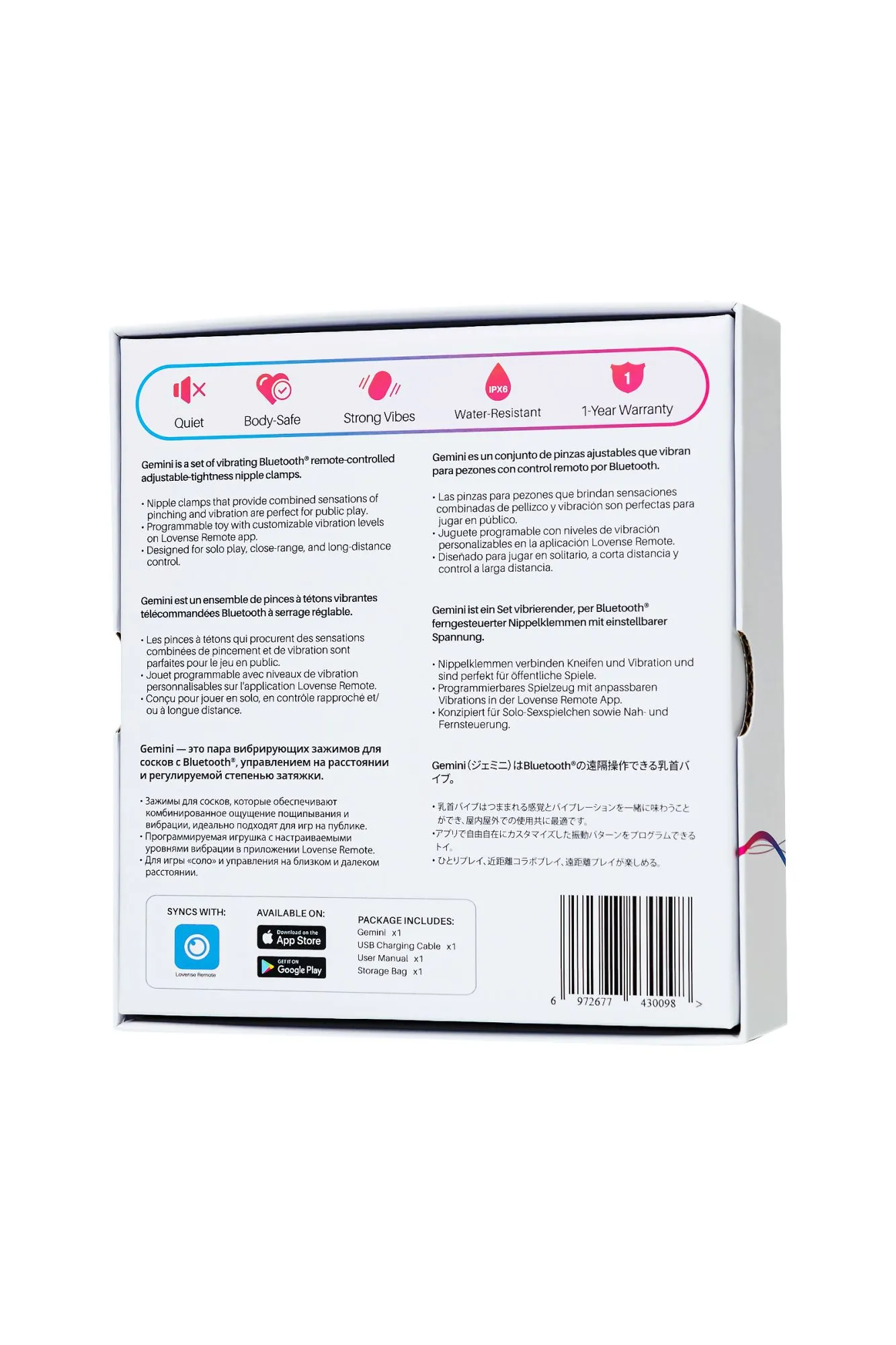 Gemini – первые в мире регулируемые вибрирующие зажимы для сосков с управлением через приложение, созданные инновационной компанией Lovense. Регулируемая двойная вибрация Получите максимальное наслаждение, контролируя силу сжатия и интенсивность вибрации двух моторов – от слабого до сверхмощного уровня. Режим "Handsfree" Носите вибрирующие зажимы для сосков Gemini на шее или закрепите их на бюстгальтере. Нейлоновые провода делают игрушку очень гибкой. Незаметно носите их и отправляйтесь навстречу новым приключениям, получая наслаждение в режиме "Handsfree". В комплекте опциональный зажим для бюстгальтера и ожерелье. Стильный и миниатюрный дизайн, чтобы незаметно носить с собой. Множество возможных вариантов игр От прелюдии, ролевой игры до легкого БДСМ – включите зажимы для сосков Gemini в свою ежедневную рутину с помощью приложения Lovense Remote! Зажимы для сосков отлично подходят для плавного перехода от ванильного секса к легкому БДСМ. Наблюдайте как реагирует ваше тело, пробуждается чувствительность и усиливается мощность и глубина оргазмов. Унисекс Gemini отлично крепятся на соски любого типа – и у женщин, и у мужчин. А также зажимы можно использовать на любой части тела. Почувствуйте приятное давление, отрегулировав силу сжатия с помощью винтиков. Сильные и долгоиграющие вибрации Два мощных мотора обеспечивают интенсивные ощущения, которые подарят множественные оргазмы. Добавляйте паттерны вибрации и интенсивности, чтобы довести себя до оргазма! Время использования до 120 минут. Режим ожидания до 120 часов. Настраиваемая игрушка – выберите и сохраните в игрушке свой любимый цвет и паттерн. Предустановленная программа: 3 уровня мощности До 10 паттернов вибрации Неограниченные возможности с приложением Lovense Remote Gemini — это полностью программируемые зажимы для сосков с управлением на расстоянии, которые можно настроить на широкий диапазон уровней вибрации. Приложение Lovense Remote позволяет выбрать уровень мощности, соответствующий вашим индивидуальным потребностям. Передайте контроль своему партнеру на расстоянии и почувствуйте наслаждение от мощного проникновения. Вы забудете, что ваш партнер не рядом с вами. Управляйте игрушкой с помощью приложения Lovense Remote или одной из игрушек с синхронизацией на расстоянии (Nora, Max 2 или Calor) на любом расстоянии. Водонепроницаемость IPX6 Легко мыть и просто содержать зажимы для сосков в чистоте. Идеальный подарок. Gemini станет отличным выбором для подарка в дополнение к любой коллекции секс-игрушек, так и в качестве первой игрушки. Что в комплекте: Вибрационные зажимы для сосков Gemini с Bluetooth USB-кабель для зарядки Руководство пользователя Сумка для хранения Опциональный зажим для бюстгальтера Опциональное ожерелье