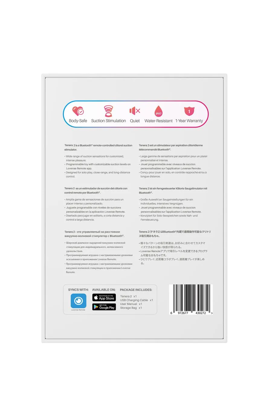 Полностью водонепроницаем Уровень водонепроницаемости IPX7 позволяет наслаждаться Tenera 2 даже в душе или ванне. Легко мойте игрушку под водой для поддержания гигиеничности. Имейте в виду, что соединение Bluetooth в воде может быть нестабильным, но это не остановит вас от того, чтобы насладиться приятными ощущениями.