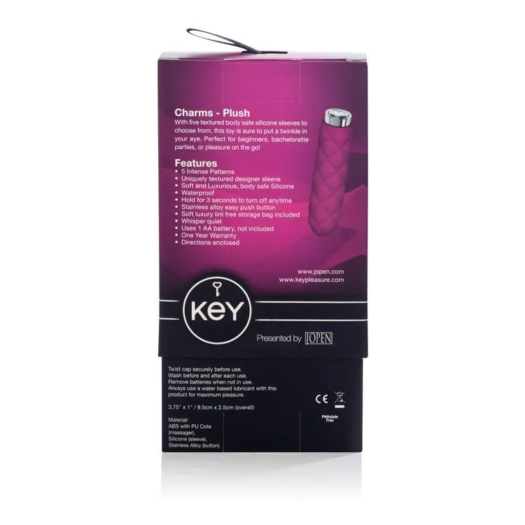 Charms Plush - это эксклюзивная игрушка с оригинальным дизайном. Компактный и удобный вибратор из премиум-коллекции Key может подарить Вам море наслаждения. Вибратор оснащен 5 различными режимами, включающими в себя вибрацию, пульсацию и функцию последовательного переключения с помощью одной кнопки. Силикон, из которого изготовлена игрушка, очень мягкий и бархатистый. Он обладает таким свойством, как принимать температуру тела, поэтому с этой игрушкой вы будете чувствовать себя комфортно. Поверхность игрушки рельефная и это обеспечивает дополнительную стимуляцию. В комплект также входит специальный чехол для хранения.