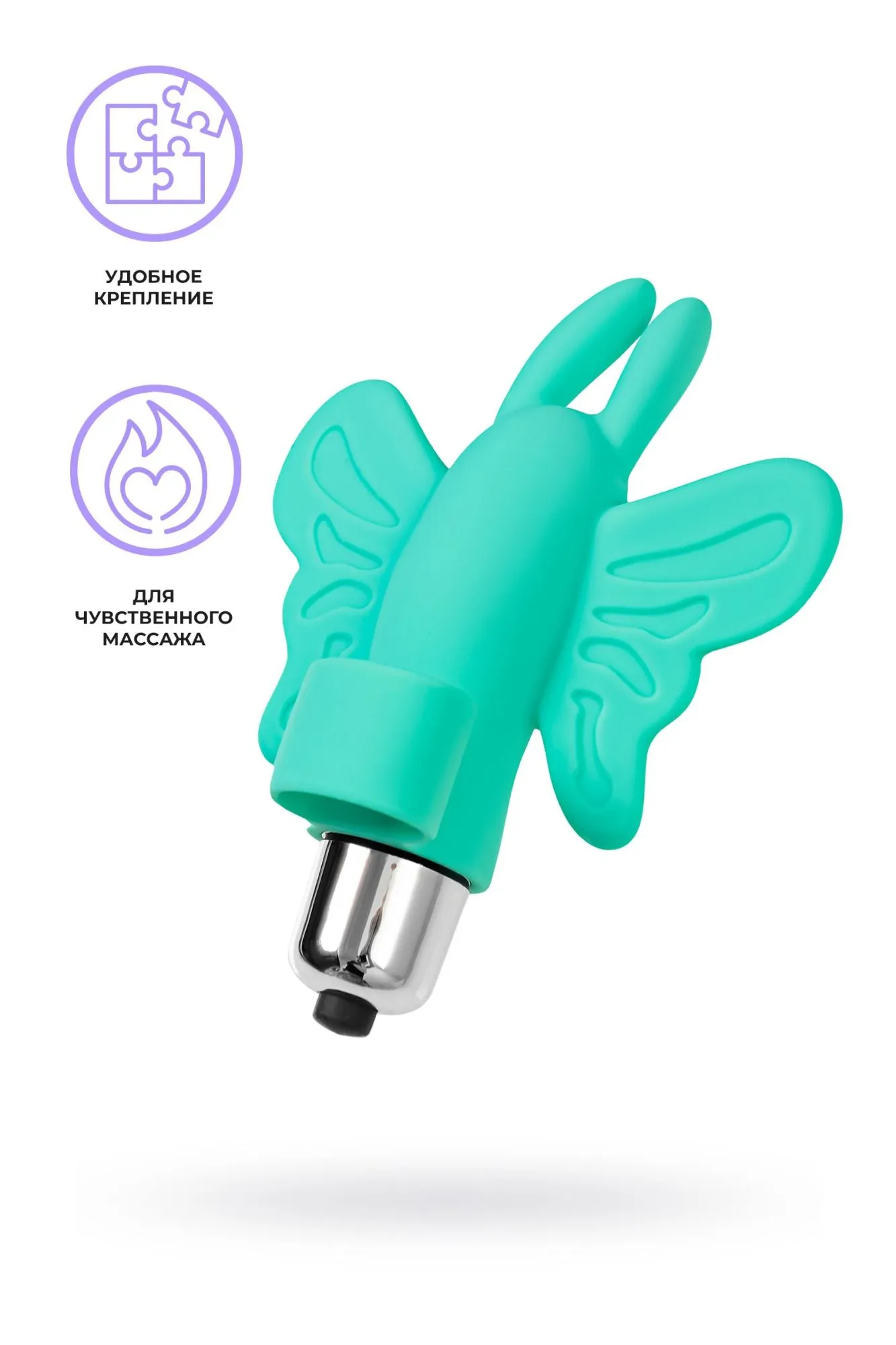 Мятная игрушка в форме бабочки со съемной вибропулей удобна в использовании за счет того, что легко надевается на палец, надежно удерживается и не отвлекает внимание от приятных ощущений. Ваша прелюдия станет нежной и продолжительной, если расширить сферу применения аксессуара, стимулируя все эрогенные точки на теле. Чувственный массаж шеи, сосков, низа живота, внутренней стороны бедер и интимных зон друг друга с помощью бархатистых ушек подарит удовольствие от начала сексуальной игры до яркой кульминации. Мягкая вибрация и возбуждающие обхватывающие движения гибких ушек приведут Тебя к клиторальному оргазму и усилят наслаждение партнера от оральных ласк.