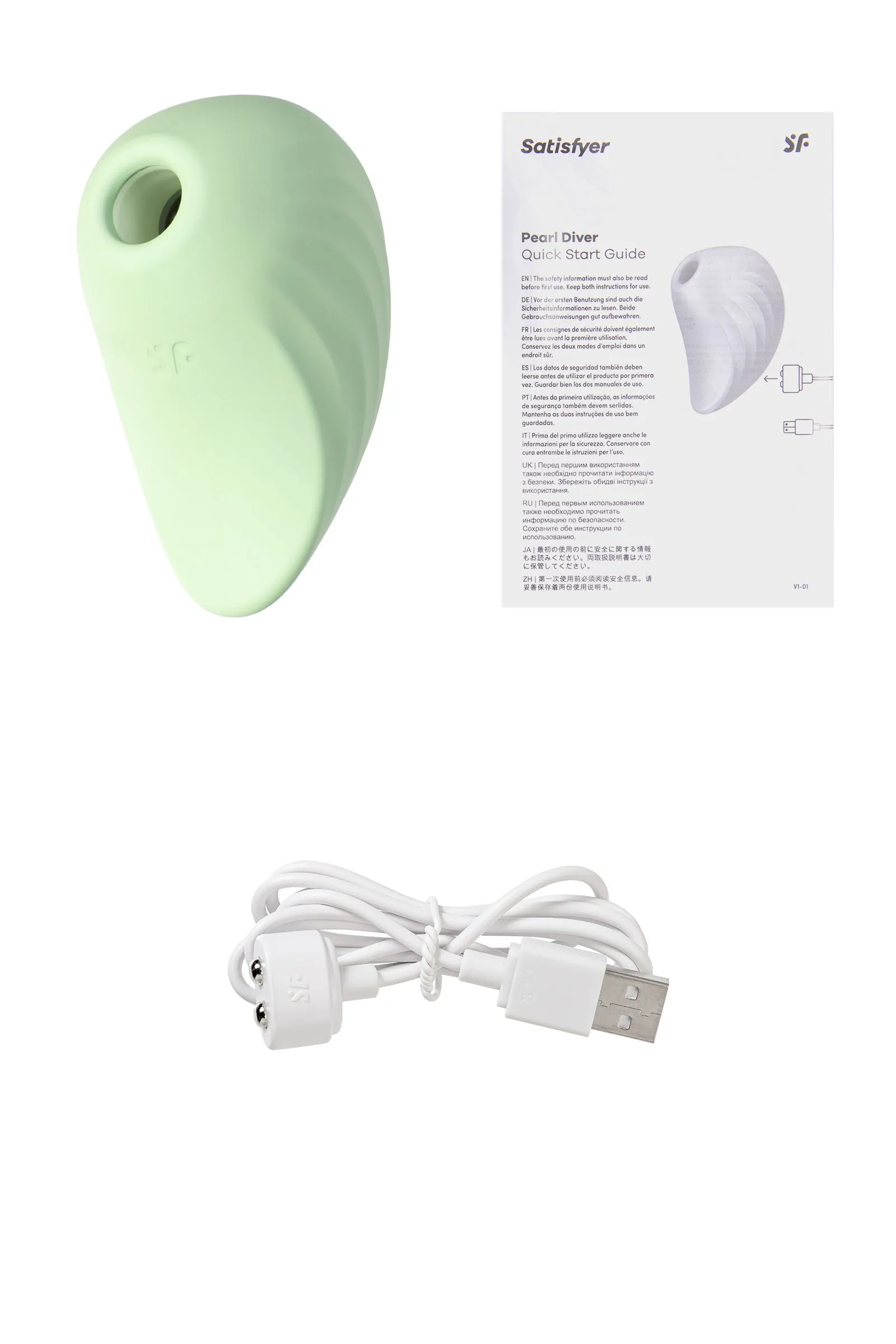 Стимулятор Pearl Diver от Satisfyer в форме ракушки не зря носит свое имя. Этот ныряльщик за жемчугом способен отыскать и порадовать вашу жемчужину невероятными посасывающими ласками и возбуждающими волнами вибрации. Сладостные минуты удовольствия обеспечены вам, если у вас в руках этот клиторальный стимулятор. С одной стороны имеется раструб, который балует вашу жемчужинку воздушной пульсацией, превосходящей любые оральные ласки. Бесконтактная стимуляция клитора – новейшая запатентованная технология Air Pulse для женских оргазмов будет сводить вас с ума снова и снова. Pearl Diver обладает двумя автономными моторами. Комбинируйте воздушную пульсацию и проникающие волны вибрации, чтобы достигать неземного блаженства каждый раз. В вашем распоряжении 11 уровней интенсивности вакуум-волновой стимуляции и 12 программ вибрации – от нежной до интенсивной. Интуитивно понятное управление с помощью трех выпуклых кнопок на корпусе. Стимулятор-ракушка удобно располагается в ладони. Благодаря нежному материалу, из которого выполнен Pearl Diver, вам будет комфортно и приятно держать его в руках и получать удовольствие от его вибрации и пульсации. Потрясающий шелковистый на ощупь высококачественный гипоаллергенный силикон – визитная карточка бренда Satisfyer. Поверхность раструба мягко и деликатно стимулирует клиторальную область, тактильно нежный и приятный на ощупь, силикон быстро адаптируется к температуре вашего тела. Идеальный размер, чтобы брать любимый стимулятор в дорогу. Стильный и качественный гаджет создан для эстетического и сексуального удовольствия. Pearl Diver любит нырять и легко составит вам компанию в водных процедурах. Благодаря водонепроницаемости принятие ванны или душа станет особенно ярким впечатлением. Чтобы получить максимум удовольствия и сохранить материал в наилучшем виде, рекомендуется пользоваться качественной смазкой на водной основе. После использования обязательно очищайте игрушку теплой водой со специальными бактерицидными спреями для интимных товаров. Особенности: Возможность одновременного воздействия на клитор воздушной пульсацией и вибрацией Оригинальный дизайн, форма и размер Управление кнопками на корпусе. 12 режимов вибрации и 11 режимов волновой стимуляции. Морской мятный цвет и мягкий, эластичный силикон без запаха, без аллергенов и вредных для здоровья веществ. Идеальный вариант для первой игрушки, подарка и путешествий. 100% водонепроницаемый - IPX7. Время работы 60 минут. Перезаряжаемый, USB-кабель, время зарядки 3 часа.