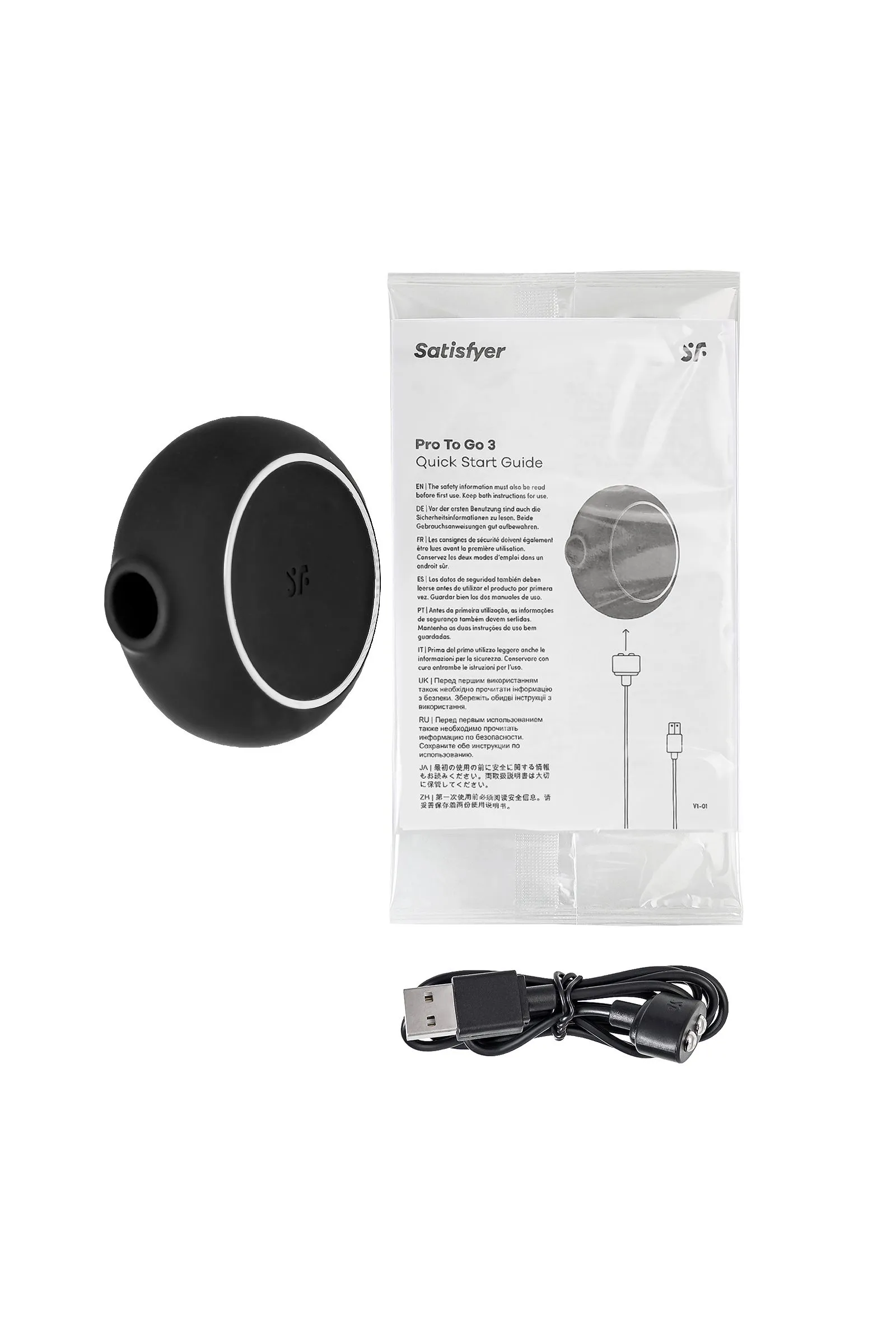 Один из самых стильных любовников для чувственных оргазмов – Pro To Go 3 от Satisfyer в черном цвете и дизайне, далеком от классических интимных игрушек. Компактный вибратор для наружной стимуляции клитора обладает двумя автономными моторами. Комбинируйте воздушную пульсацию и проникающие волны вибрации, чтобы достигать неземного блаженства каждый раз. Бесконтактная стимуляция клитора – новейшая запатентованная технология Air Pulse для женских оргазмов. В вашем распоряжении 11 уровней интенсивности вакуум-волновой стимуляции и 12 программ вибрации – от нежной до интенсивной. Интуитивно понятное управление с помощью трех кнопок на корпусе. Стильный дизайн Pro To Go 3 напоминает компактную пудреницу или гаджет для красоты, и превосходно лежит в ладони. При этом вибрация в корпусе значительно менее ощутима, чем в основной контактной части. Идеальный размер и форма, чтобы брать любимый стимулятор в дорогу. Стильный и качественный гаджет создан для эстетического и сексуального удовольствия. Потрясающий шелковистый на ощупь высококачественный гипоаллергенный силикон – визитная карточка бренда Satisfyer. Поверхность раструба мягко и деликатно стимулирует клиторальную область. Тактильно нежный и приятный на ощупь силикон быстро адаптируется к температуре вашего тела. Чтобы получить максимум удовольствия и сохранить материал в наилучшем виде, рекомендуется пользоваться качественной смазкой на водной основе. После использования обязательно очищайте вибратор теплой водой со специальными бактерицидными спреями для интимных товаров. Благодаря водонепроницаемости дарить себе удовольствие можно даже принимая ванну или душ. Особенности: Возможность одновременного воздействия на клитор воздушной пульсацией и вибрацией Управление кнопками на корпусе. 12 режимов вибрации и 11 режимов волновой стимуляции. Черный цвет и мягкий, эластичный силикон без запаха, без аллергенов и вредных для здоровья веществ. Глянцевые вставки ABS-пластика. 100% водонепроницаемый - IPX7. Перезаряжаемый, USB-кабель.