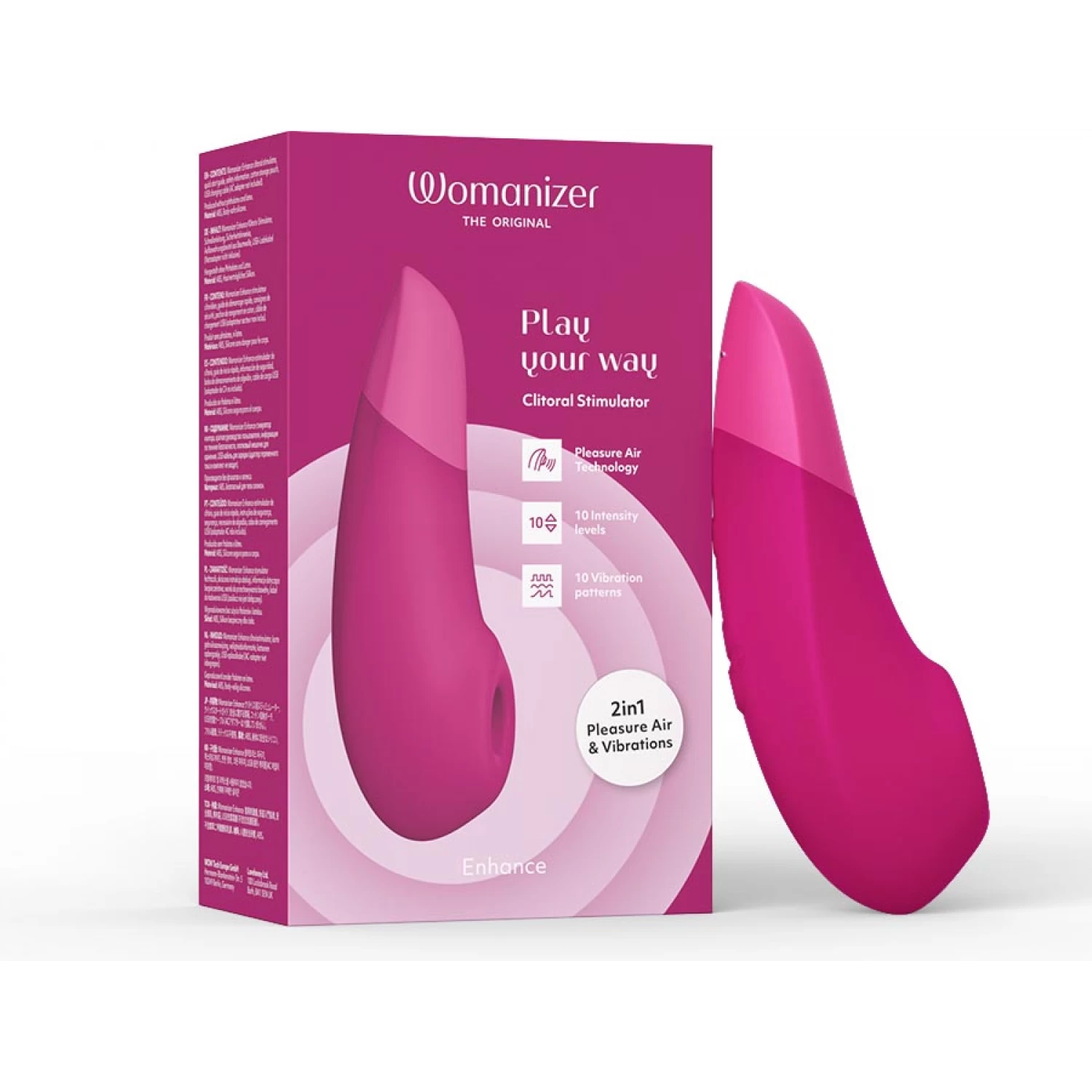 В вашем распоряжении 10 уровней интенсивности Pleasure Air, 10 уровней мощности вибрации и 10 режимов вибрации, которые регулируются индивидуально, - более 1000 способов получить удовольствие с Womanizer Enhance. Переключать режимы для обоих видов стимуляции возможно вместе и или по отдельности, благодаря кнопкам на корпусе. Полный заряд достигается за 2 часа и обеспечивает до 120 минут работы моторчиков.
