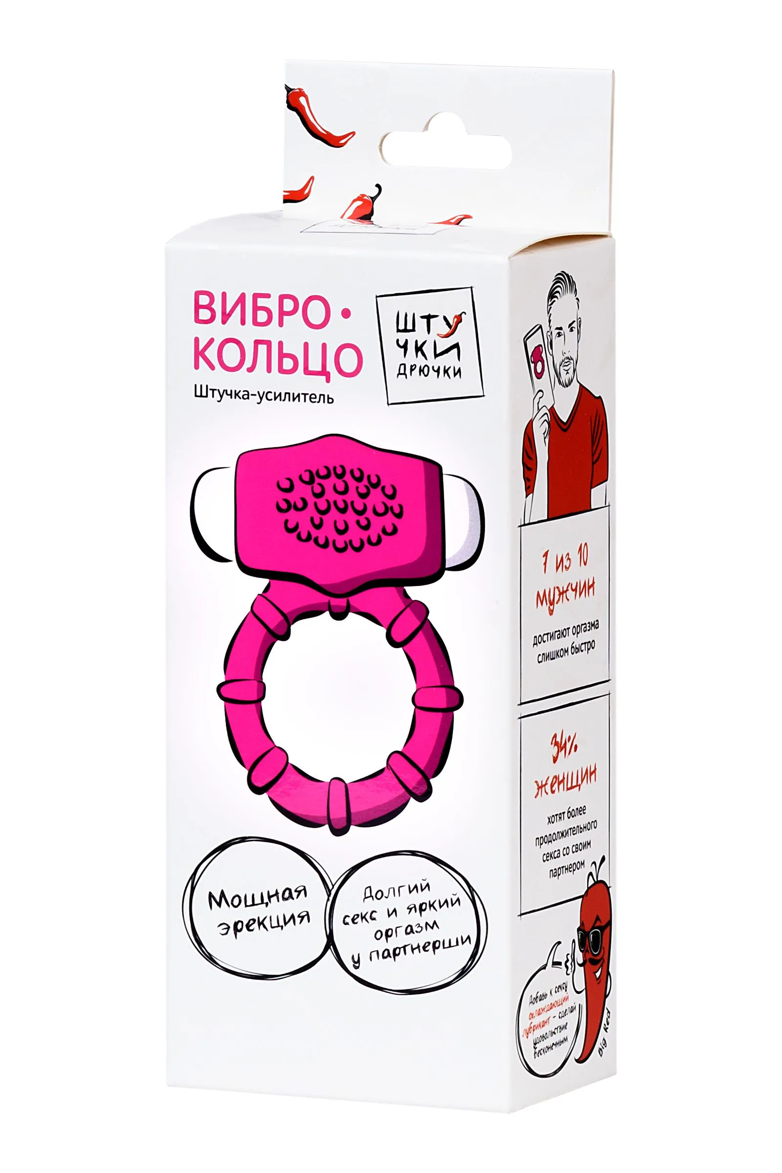 Я — представитель нового поколения эрекционных колец — виброкольцо «Штучки-Дрючки». Мой дед был простым неэластичным кольцом и мог только продлевать эрекцию. Я же забочусь не только о репутации мужчины, но и об удовольствии партнерши: съемный виброэлемент своими нежными вибрациями пробуждает ее эрогенные точки; а мягкие озорные шипики дарят дополнительный чувственный массаж, доводя просто удовольствие до взрывного оргазма. Наслаждайся плодами эволюции вместе с «Штучки-Дрючки» и выведи свое удовольствие на новый уровень.