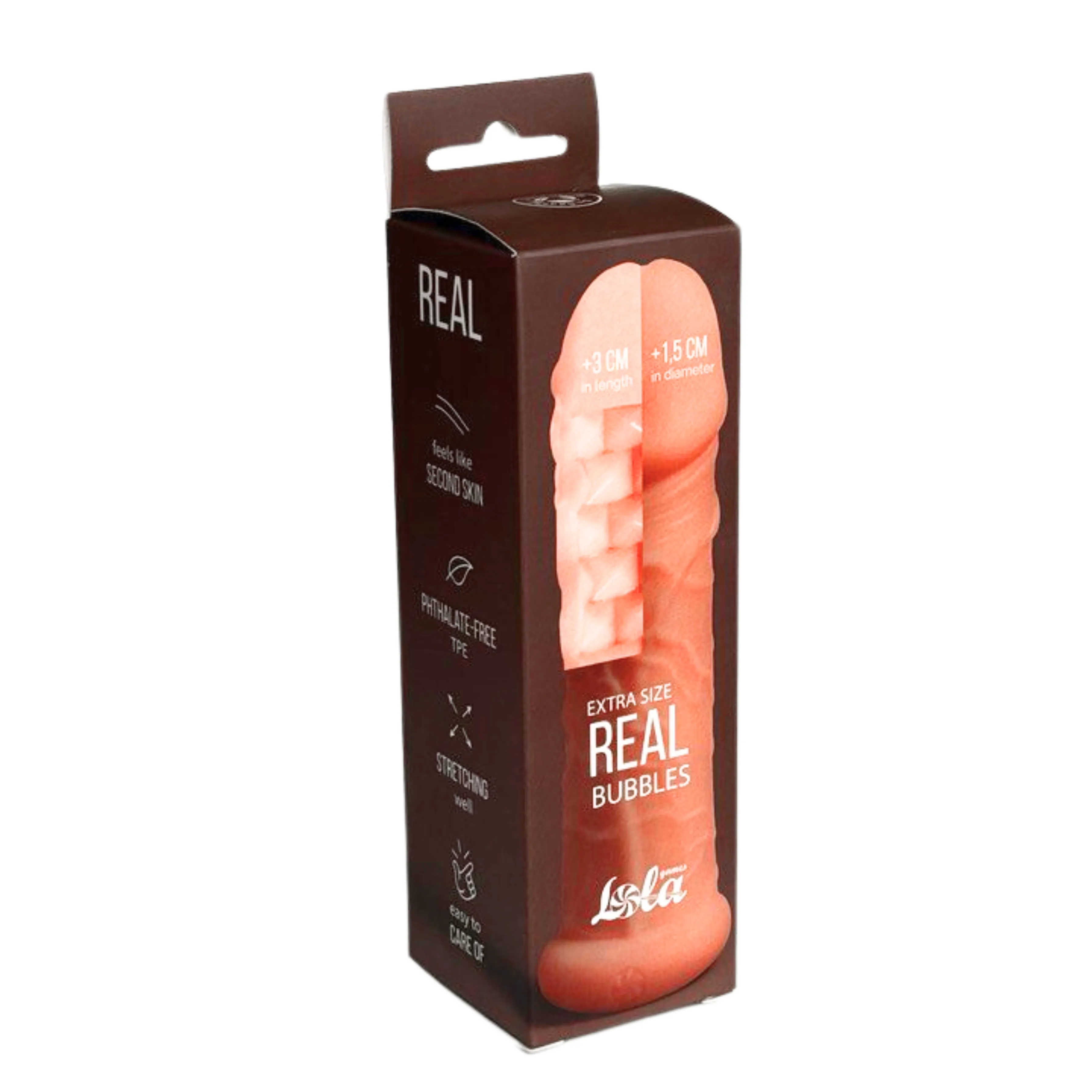 Насадка для пениса The Real Extra Size сделает пенис длиннее на 3 см благодаря встроенному удлинителю и диаметр больше на 1,5 см. А двусторонний яркий рельеф насадки - реалистичный снаружи и с пузырьками внутри - добавит стимуляции обоим партнерам одновременно во время полового акта! Насадка изготовлена из нежного материала, который будет ощущаться как вторая кожа. Фиксирующее кольцо очень мягкое и отлично растягивается, позволяя надежно закрепить насадку под мошонкой предотвращая её спадание. Не использовать вместо презерватива.