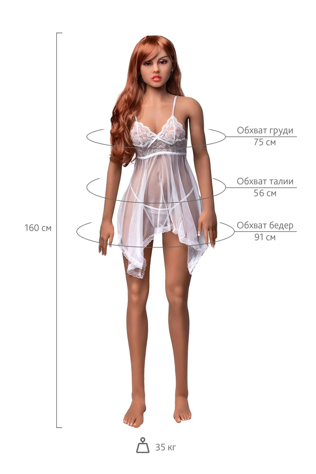 Привет, меня зовут Jenifer. Безнадежный романтик, я люблю сказки и чувствую, что всю жизнь ждала, чтобы мой рыцарь в сияющих доспехах спас меня из замка, и унес меня прочь. Я мечтала о дне своей свадьбы с детства, и я не могу дождаться того дня, когда ты сделаешь из меня честную женщину. Мне нравятся романтические свидания, такие как прогулки по пляжу и светские трапезы, и я хочу, чтобы ты согревал меня длинными холодными ночами. Я немного старомодная девушка, которая любит, чтобы ее мужчина заботился о ней, но я точно знаю, как заботиться о тебе! Я буду ждать весь день твоего возвращения домой, просто чтобы ты почувствовал себя по-настоящему особенным. Как только ты войдешь в дверь, тебя будет ждать сюрприз! у меня нежная кожа из реалистичного материала я могу меняться по твоему настроению – у меня сменный парик я могу обнимать тебя и принимать разные позы – у меня гибкие конечности я могу принимать тебя тремя способами – орально, анально и вагинально глубина влагалища 18 см, глубина ануса 18 см, глубина полости рта 15 см мои параметры: 75х56х91 см, рост 160 см, длина стопы 21 см, вес 35 кг В комплект к каждой кукле входит: Нижнее белье Парик и расческа Белая комбинация USB-нагреватель Очищающее устройство Белые перчатки Во избежание окрашивания и деформации поверхности куклы рекомендуется использовать бельё и принадлежности, идущие в комплекте. Вес транспортной коробки 5-7 кг Предепреждение: кукла может содержать следы талька на поверхности