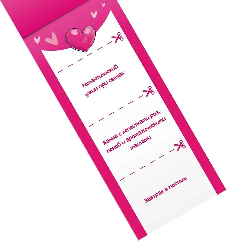 Перед вами романтические купоны, которые помогут подарить друг другу яркие, искренние и незабываемые эмоции. Наслаждайтесь воплощением ваших самых романтических фантазий. И помните: делать это можно в любое время дня и ночи!