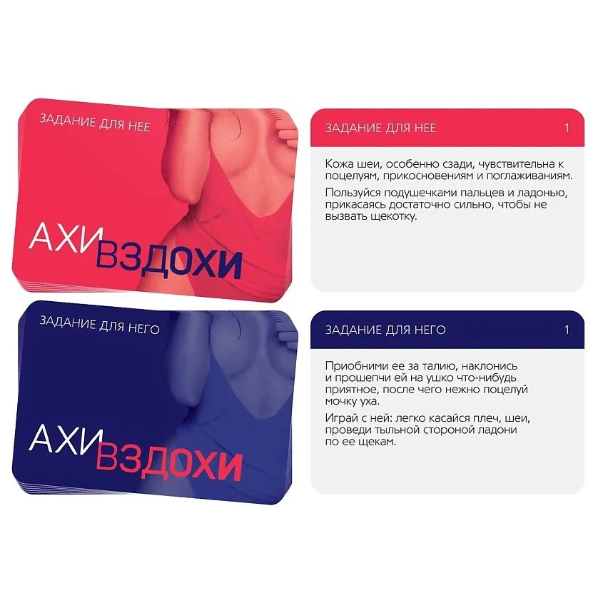 Этот набор позволит вам разнообразить сексуальную жизнь и добавить в неё немного перчинки. Вас ждут 20 карт с возбуждающими заданиями «Для него» и «Для неё» из серии «Ахи-вздохи», а также пэстисы (специальные накладки на грудь) и вибратор-зайчик. По очереди вытягивайте карточки, зачитывайте их содержание и выполняйте задания.