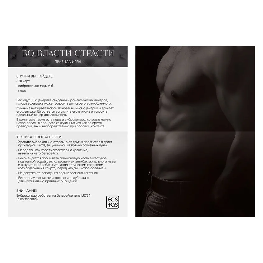 В комплекте вас ждёт 30 карточек-заданий, а это целых 30 свиданий и романтических вечеров, которые девушка может устроить для своего возлюбленного. Мужчина внимательно изучает карточки и выбирает любую понравившуюся. Задача девушки – воплотить её в жизнь и устроить романтическое свидание для любимого. Закончиться оно должно сексом в вашей постели или любом другом месте. В комплекте также есть виброкольцо и перо, которые можно взять с собой на свидание, чтобы вечер завершился бурным оргазмом.