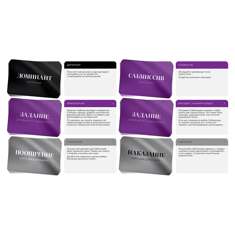 Как пользоваться набором? Внутри вы найдёте карты с разными локациями и эротическими идеями, благодаря которым посещение привычных мест в городе уже не будет прежним. Подпишите договор о неразглашении и выберите желаемую роль. Один из вас будет доминирующим (доминантом), а другой — подчиняющимся (сабмиссивом).