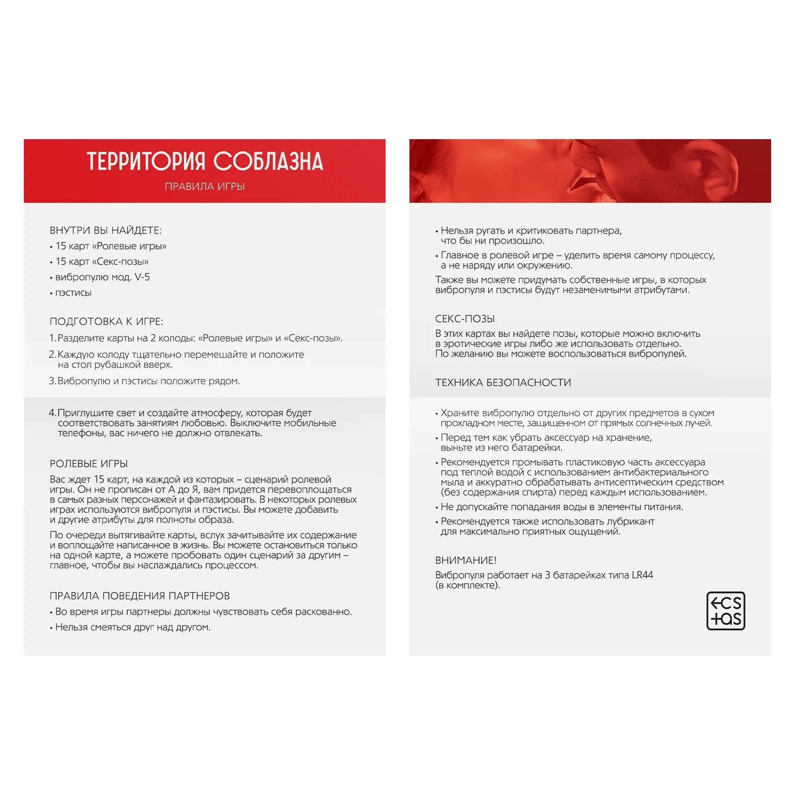 В комплекте также есть карты с секс-позами, которые можно включить в эротические игры, либо же использовать отдельно. По желанию можно использовать аксессуары, которые есть в комплекте, чтобы разнообразить игру и добавить в неё перчинки.