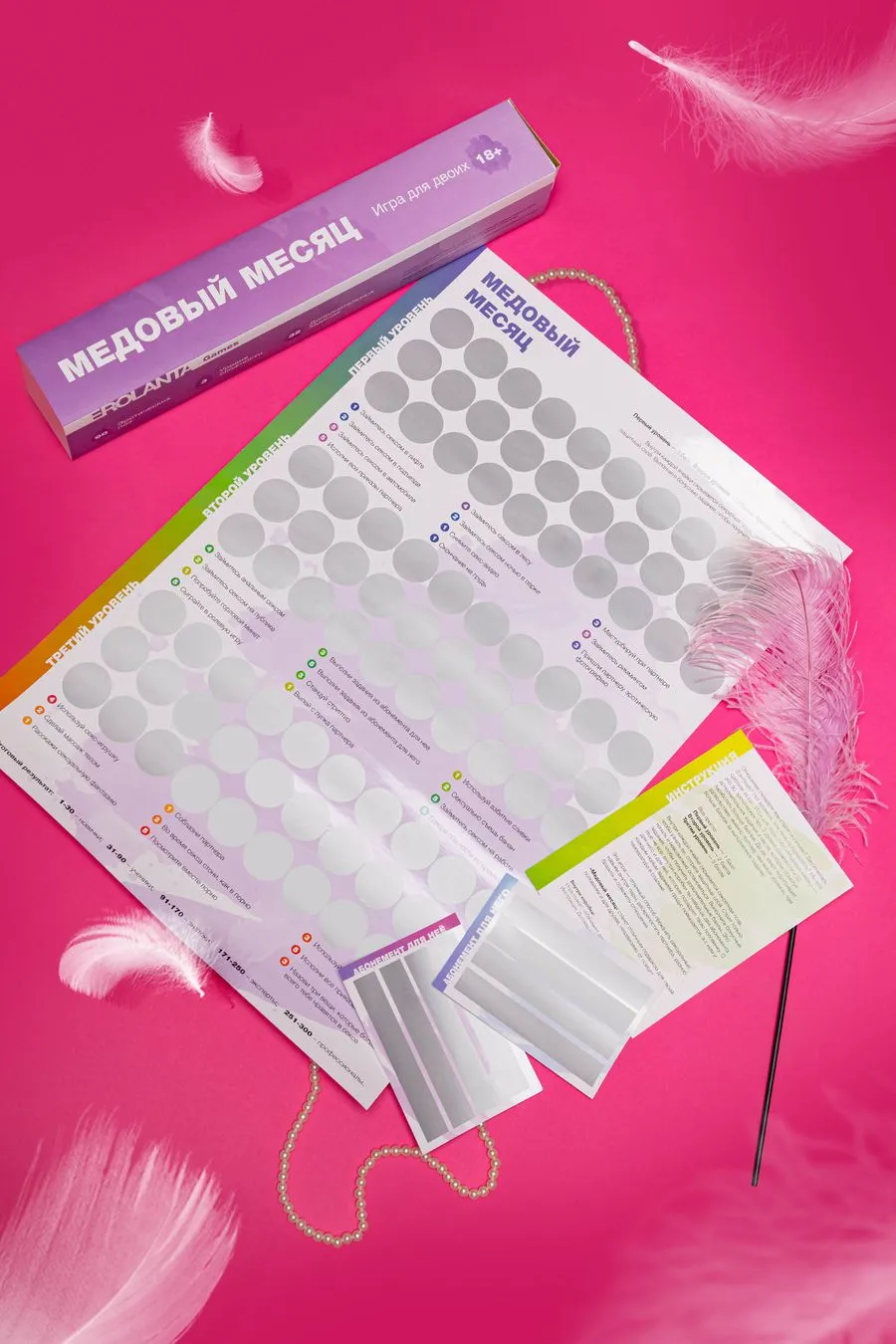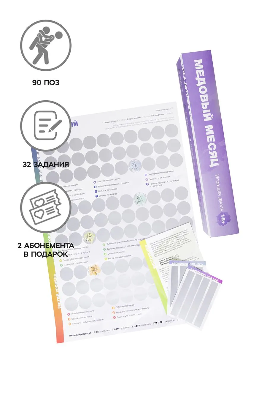 Специальный скретч-плакат содержит 90 эротических поз, 3 уровня сложности и 32 бонусных задания. Выполняйте задания и набирайте максимальное количество баллов, чтобы пройти путь от новичков к профессионалам. Азартная игра позволяет каждому участнику открывать для себя новые грани удовольствий и демонстрировать способности. Игра способна пощекотать нервы, ведь все позы скрыты защитным слоем, а общий результат зависит от вклада каждого участника. Если считаете себя продвинутым игроком, начинайте сразу с третьего уровня. Или продвигайтесь по карте постепенно, создавая свой неповторимый индивидуальный путь.