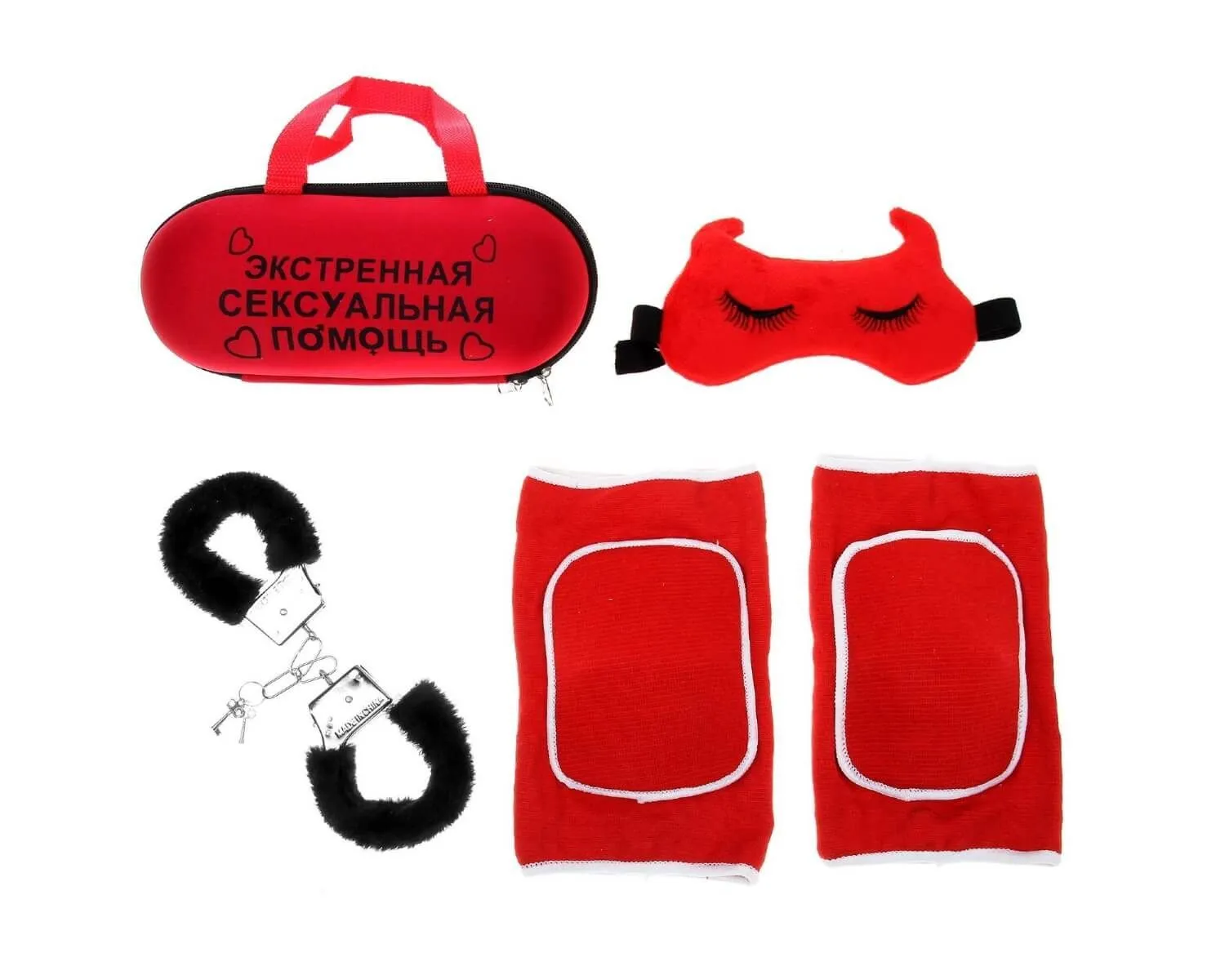 В наборе: наколенники, маска для сна, наручники, чехол.