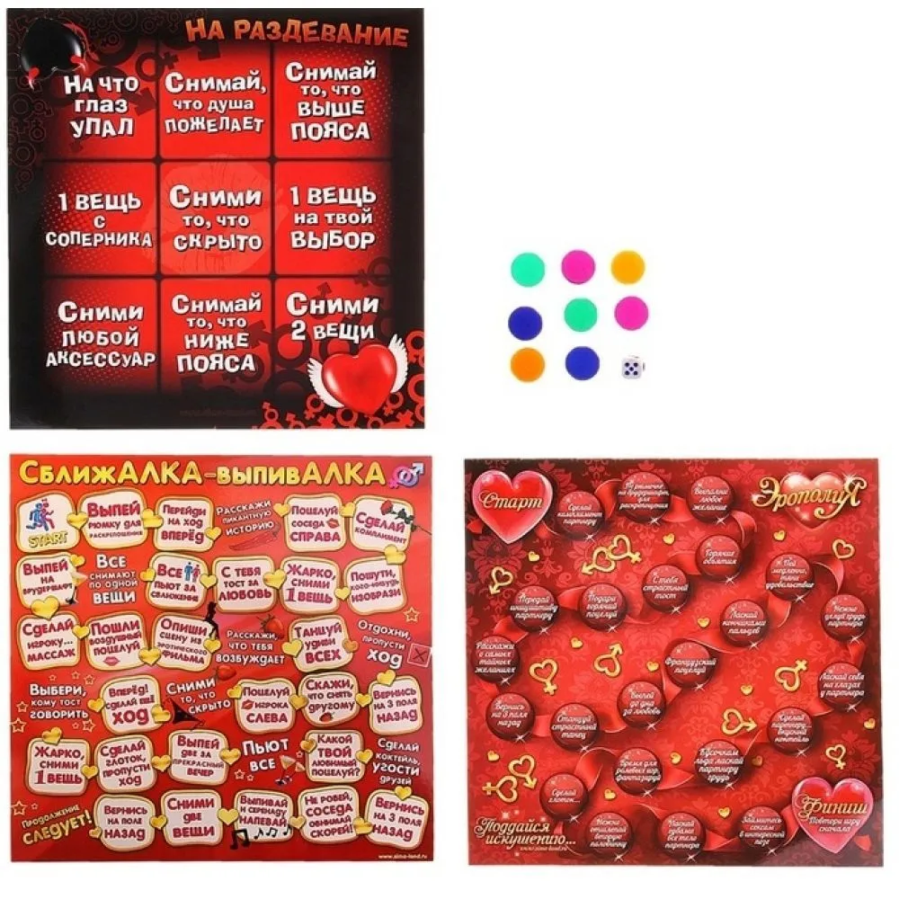 Набор эротических игр для вечеринок. Набор содержит три игровых поля, 8 фишек и шестигранный кубик. В комплекте присутствуют игры «сближалка-выпивалка», «Эрополия» и «На раздевание». Игры с простыми правилами содержат различные задания связанные с эротической тематикой или алкоголем. Удачный выбор для пикантной вечеринки или оригинального времяпрепровождения тет-а-тет.