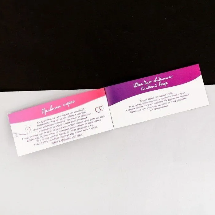 В наборе "20 первых свиданий" Вы найдете 10 советов, которые помогут Вам организовать прекрасное свидание и покорить сердце своей пары. Сделайте свидание еще более запоминающимся и сыграйте в предложенные на купонах романтические игры. Выберите понравившуюся игру и вручите ее своей второй половинке, чтобы вместе сыграть в нее. Подарите друг другу прекрасные и волнующие первые свидания, которые помогут вашей любви расцвести!